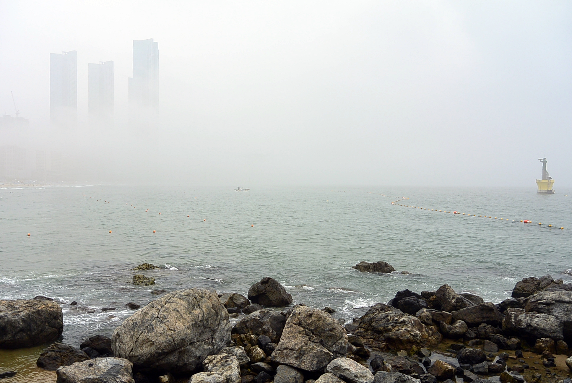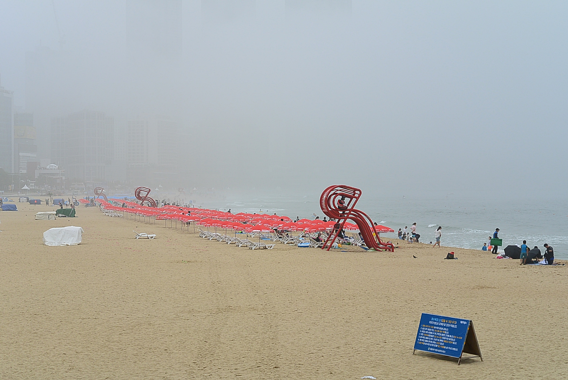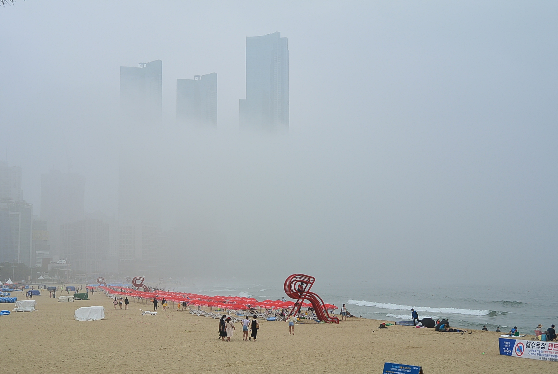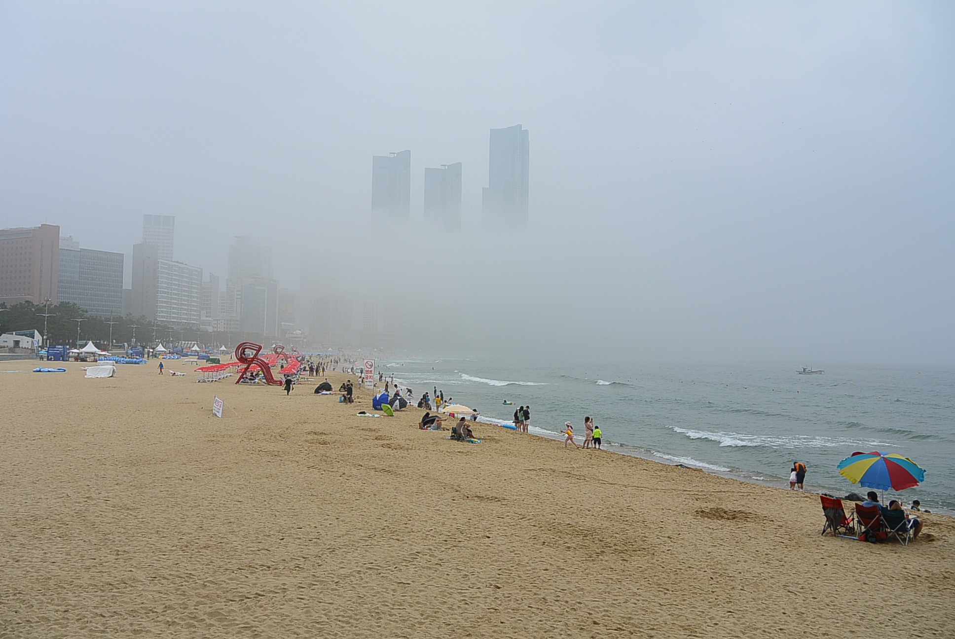 해운대해수욕장. 안개로 인하여 달맞이언덕은 사라지고 ~