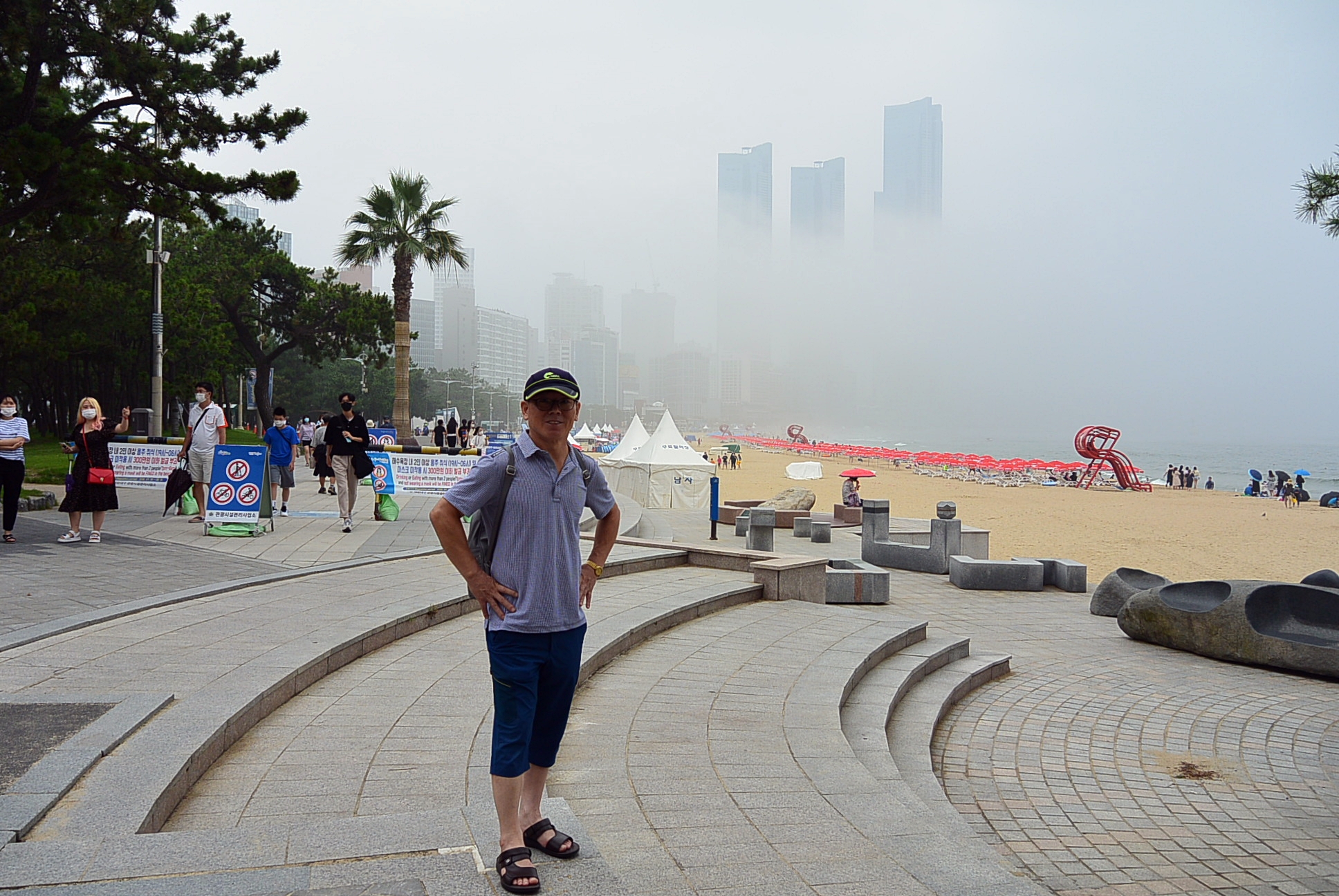 물난리로 인해 전국이 시끄럽다. 장마비가 부산을 강타하더니 대전. 서울. 경기. 강원 전국으로 다니면서 물폭탄을 쏟아붓고 있으니, 댐 방류가 시작되고 .... 한강 수위가 위험하다 하고, 인명피해 사망자 실종자 속출하고, 올 여름엔 기록적인 무더위라고 하더니 무더위는 커녕 물난리가 기록적이네. 2주넘게 비오고 흐리고 티비 뉴스에서는 마을이 잠기고 산사태나고 집이 떠내려가고 부서지고 ......... 정말 많은 피해를 입고 있는 요즘이다. 마음도 심란하고 올 여름 휴가는 코로나19, 장마로 인하여 없어진것처럼 해운대 해수욕장도 썰렁하다. 오늘도 비는 오락가락 하고 있다. 일주일 내내 집에만 있으면서 마트나 다녀오고 했더니 좀이 쑤신다 나가고 싶어서 ~~ ㅋㅋ 비가와도 바람을 쏘여야겠다 싶어 동백섬 주차장서부터 누리마루 동백섬 해운대해수욕장을 살방살방 걸어서 다녀왔다. 안개가 자욱하여 엘시티 건물은 붕 떠있는듯 꼭대기 머리만 보이고 있고, 국지성 소나기 내리다 그치다를 반복하면서 ~~ 송정가서 점심먹고 집으로 ...... 짧은 나들이였다.