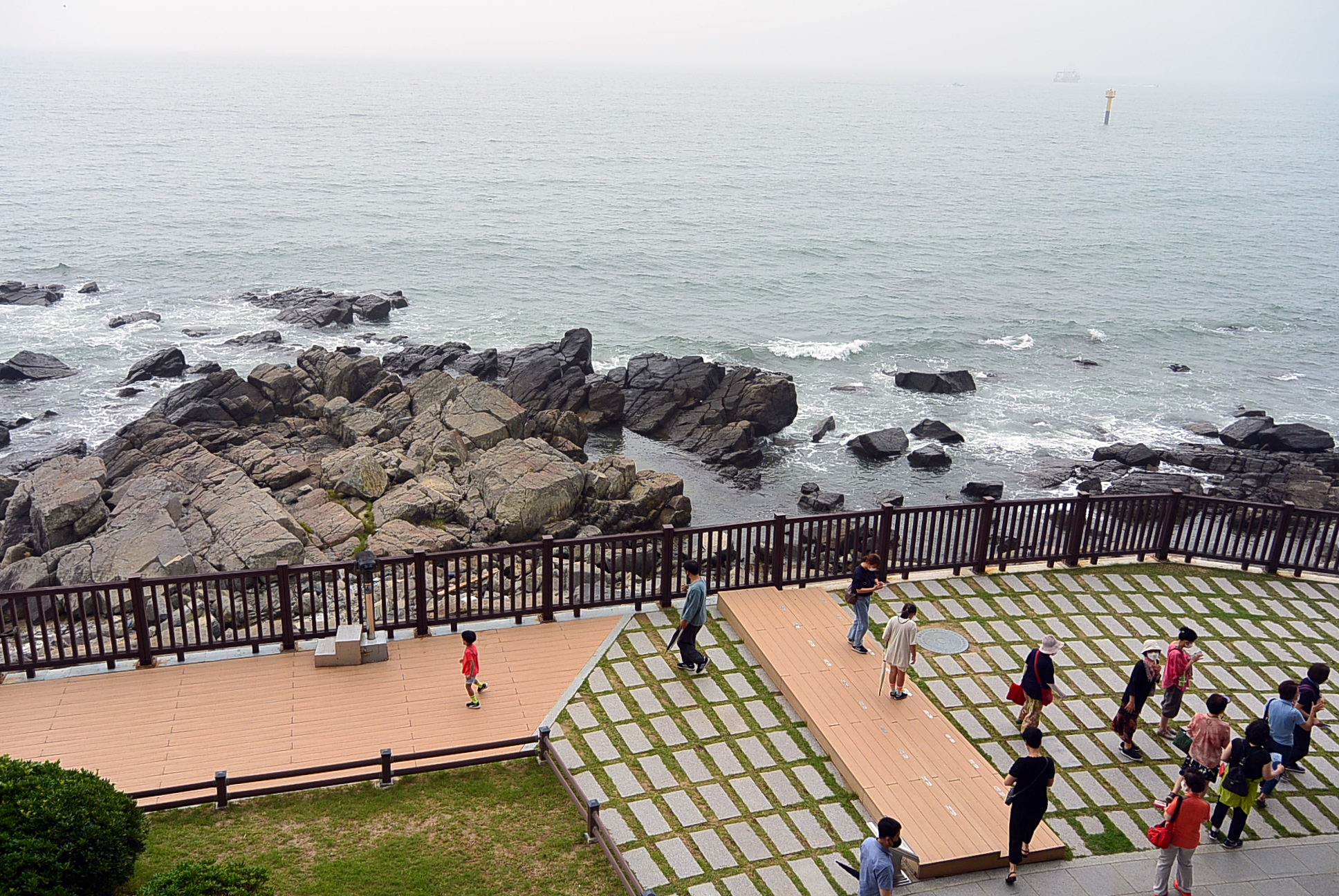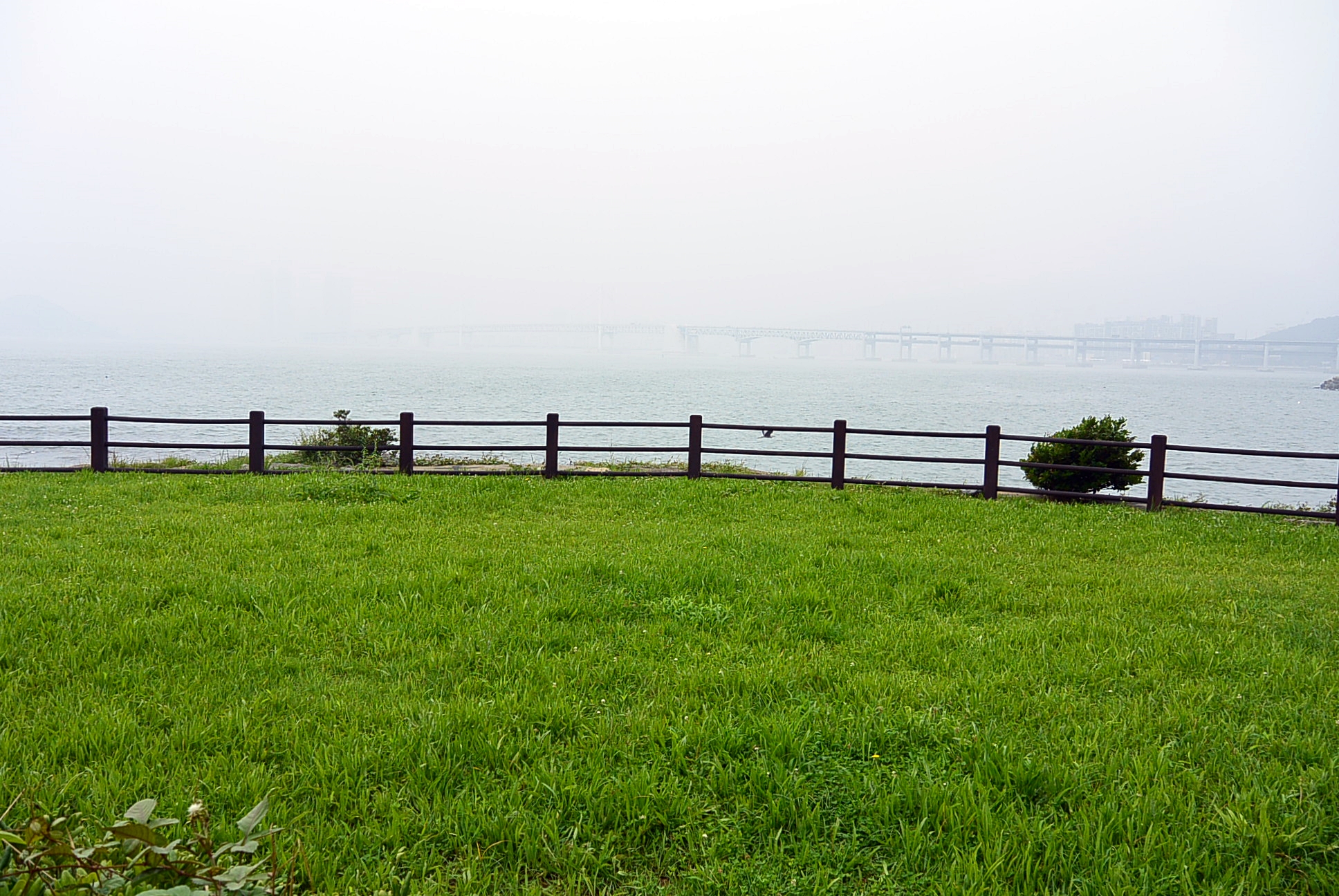 잔디밭 울타리 넘어 광안대교는 안개속으로 잠기고 ~