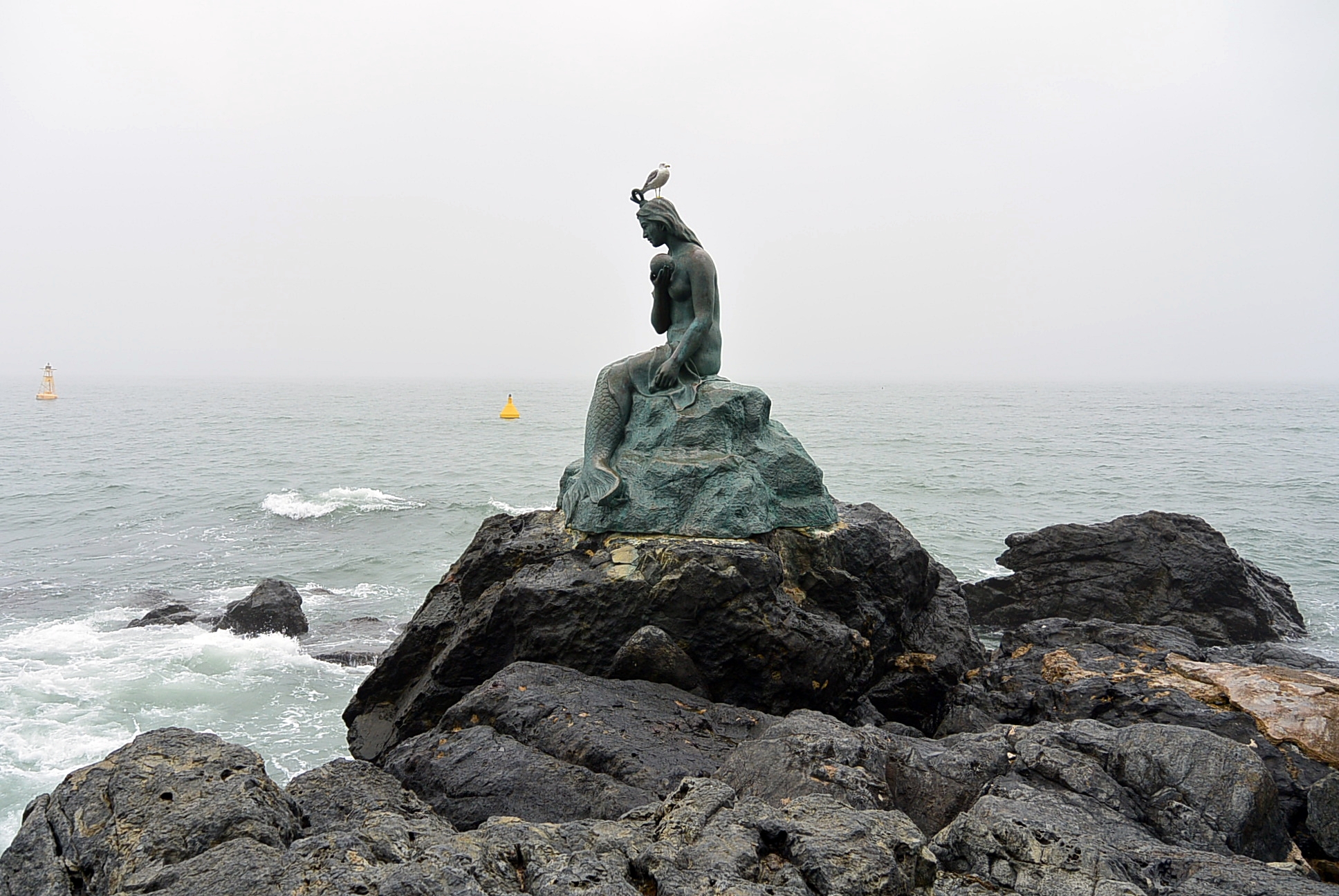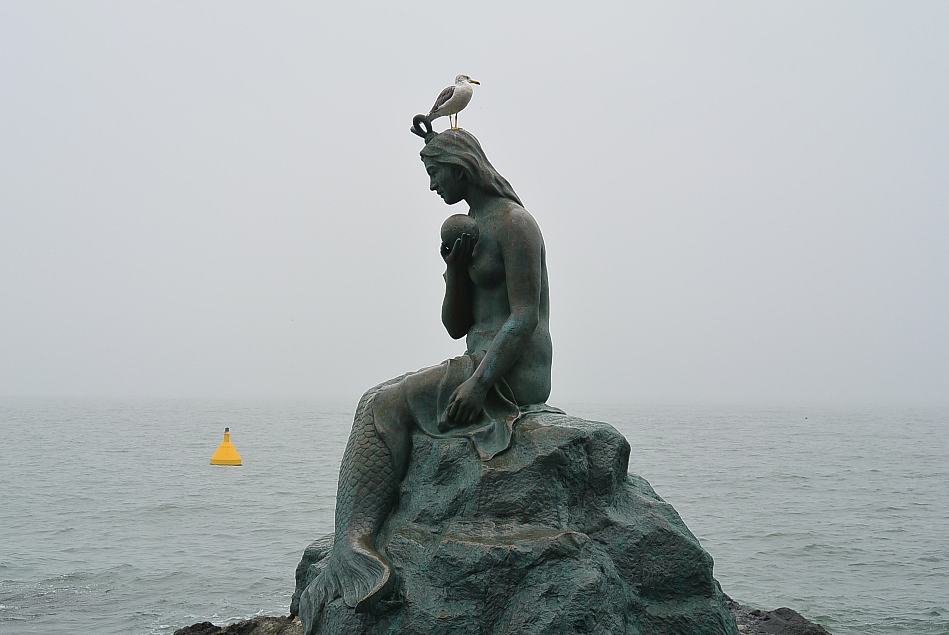 인어아가씨 동상 머리위에 갈매기 한마리. 비바람이 불어도 꼼짝을 안하네.