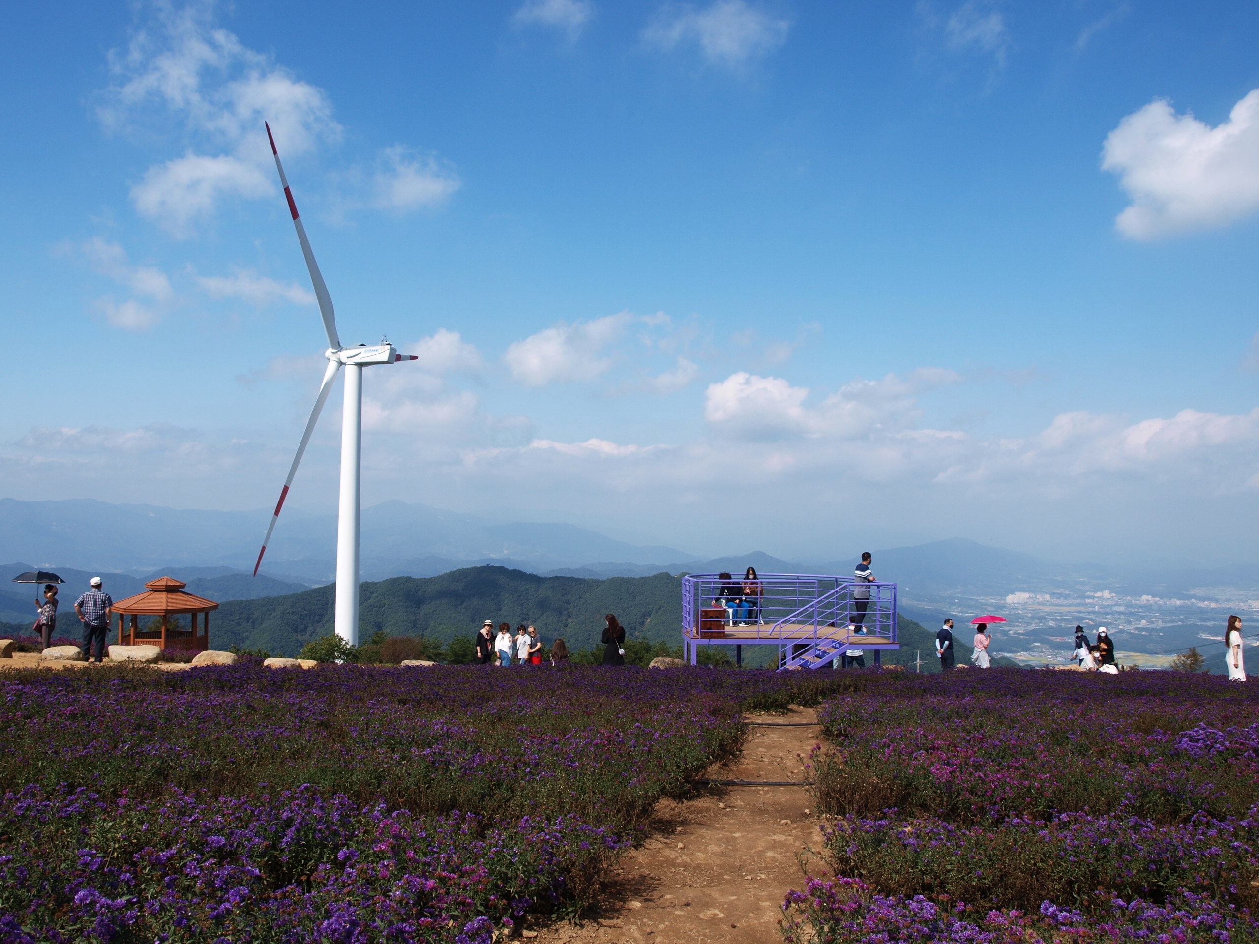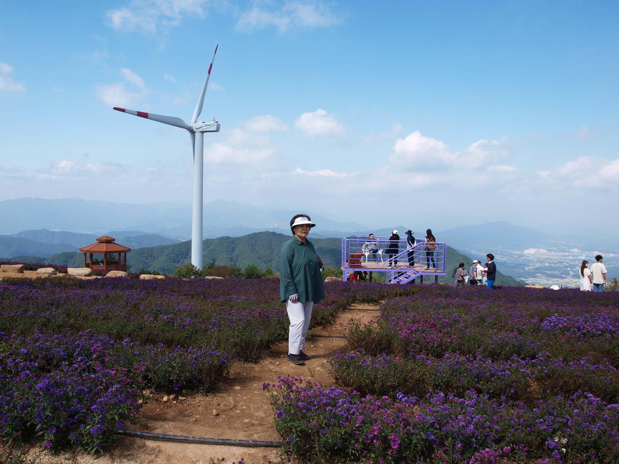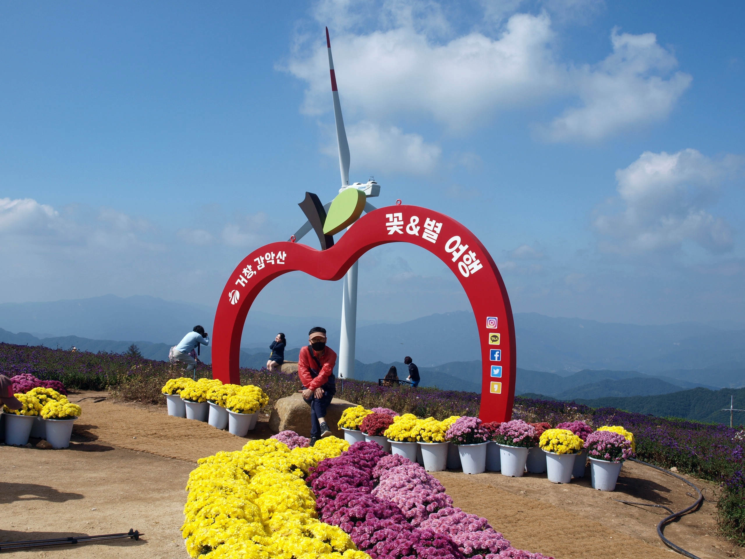 요즘 핫하게 뜨고있는 거창 감악산 '꽃&별여행' 아스타국화가 피어 천상의 화원이라는 이름을 갖게된 곳을 다녀왔는데 아쉽게도 아스타국화 꽃이 지고있어 좀 그랬다. 풍력발전단지가 있어 바람개비와 아래로 펼쳐지는 산 그리메가 있어 말 그대로 천상의 화원이었다.