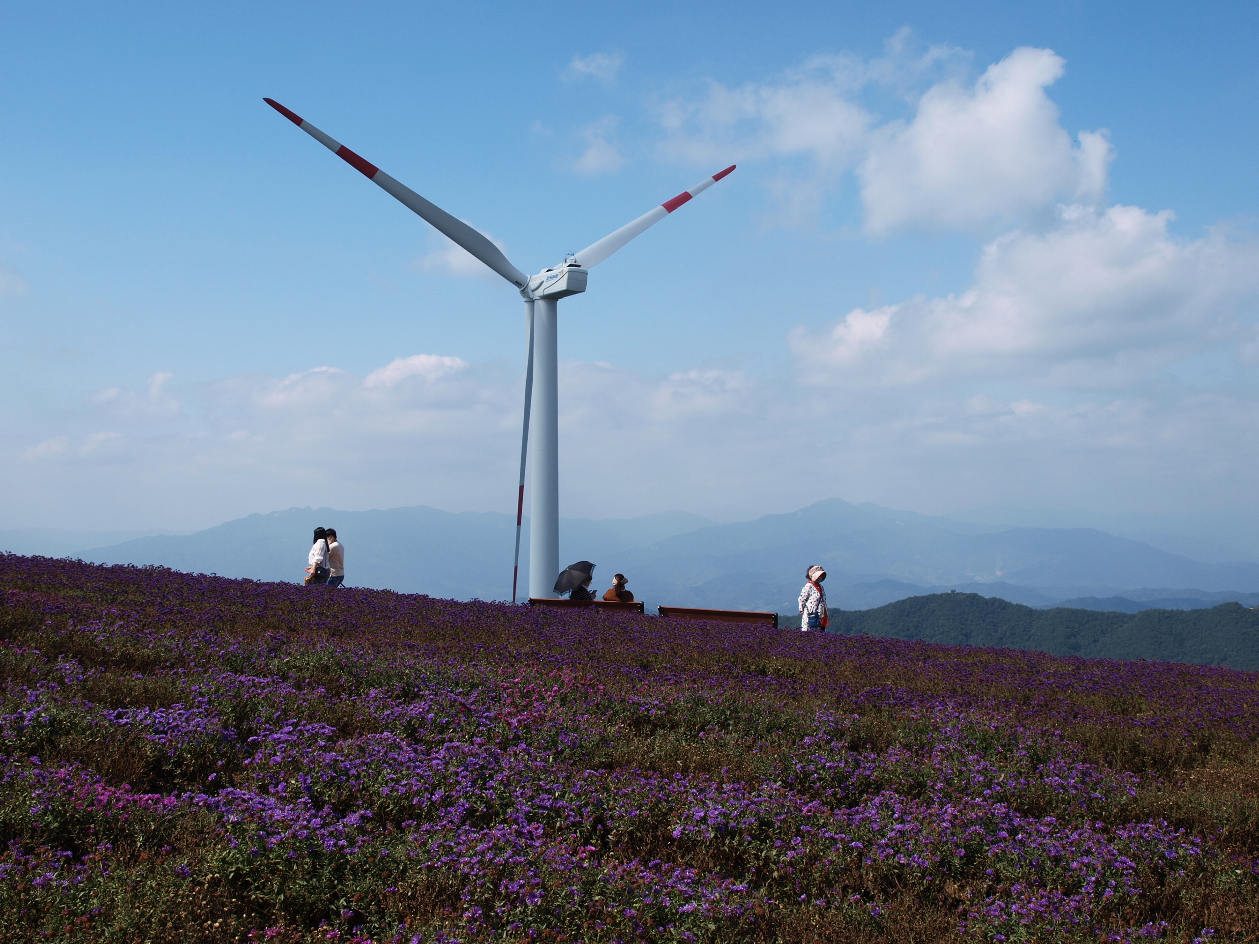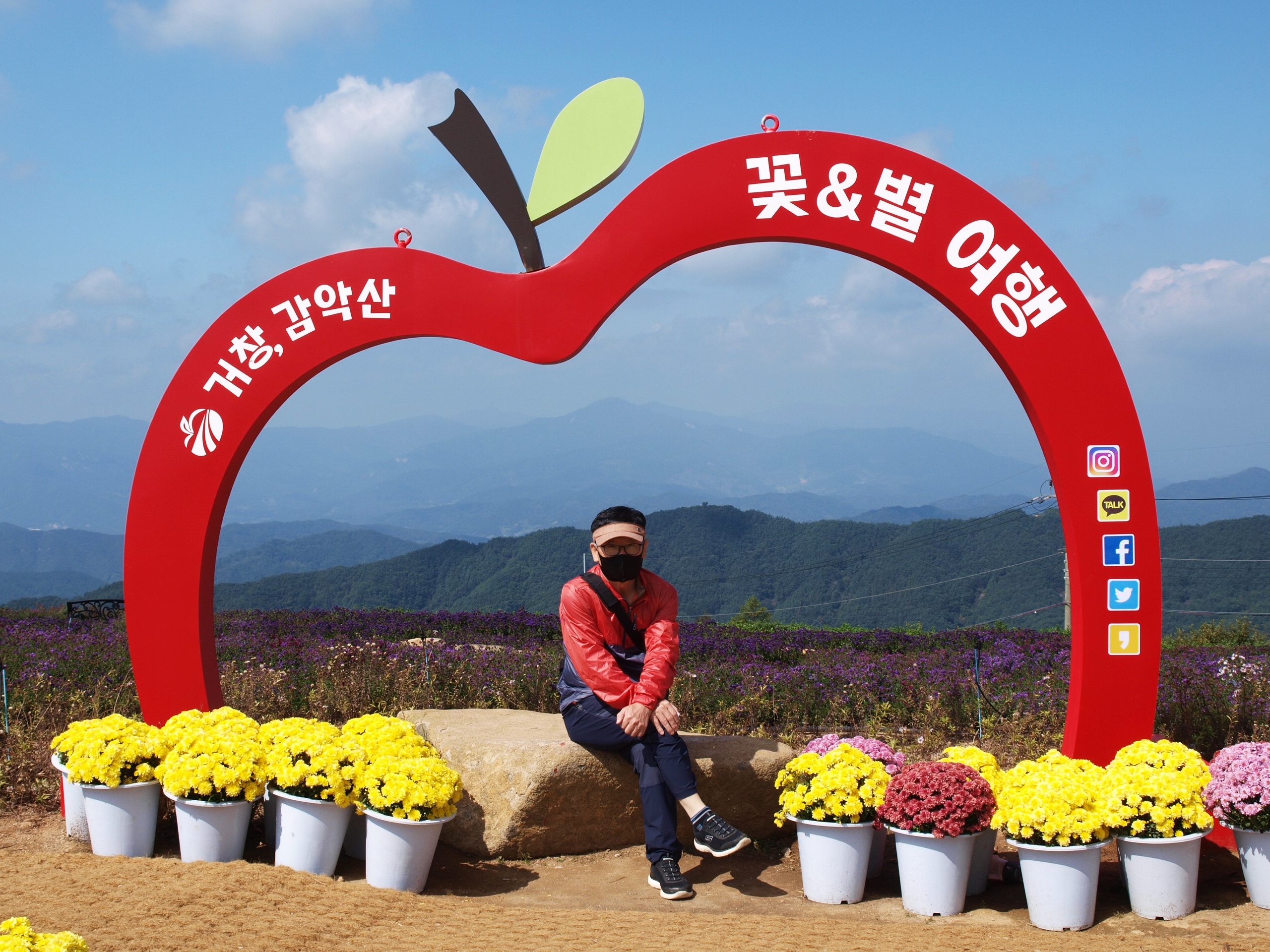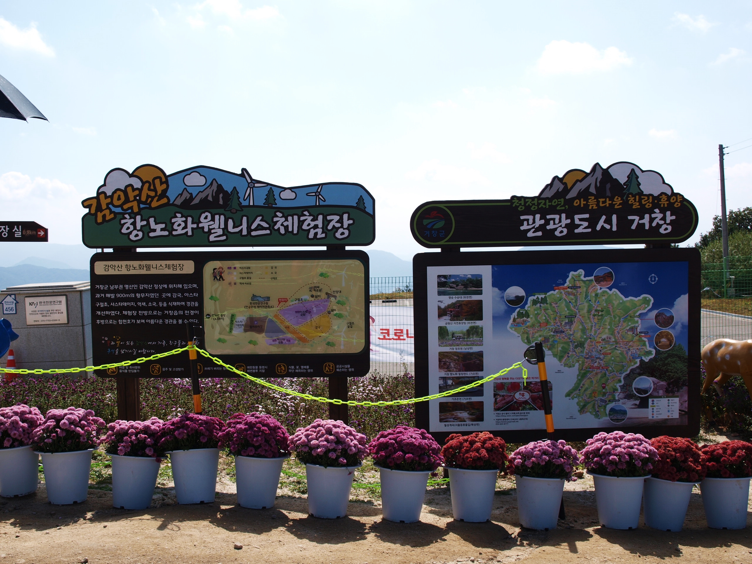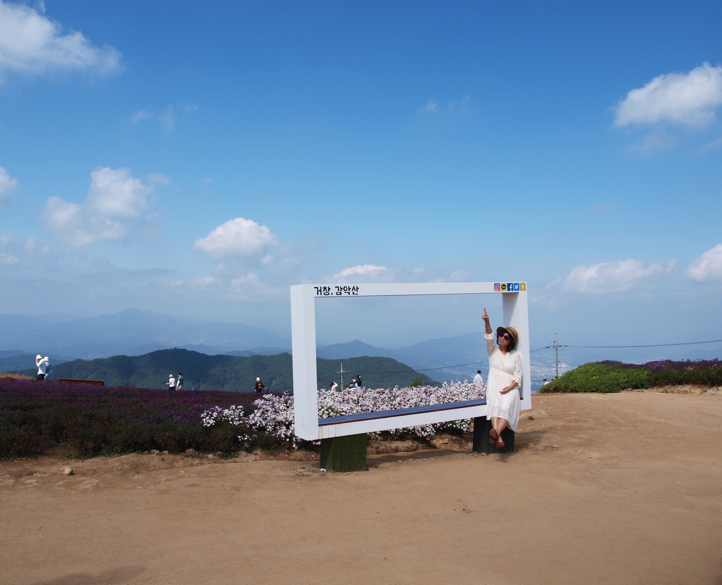 요즘 핫하게 뜨고있는 거창 감악산 '꽃&별여행' 아스타국화가 피어 천상의 화원이라는 이름을 갖게된 곳을 다녀왔는데 아쉽게도 아스타국화 꽃이 지고있어 좀 그랬다. 풍력발전단지가 있어 바람개비와 아래로 펼쳐지는 산 그리메가 있어 말 그대로 천상의 화원이었다.