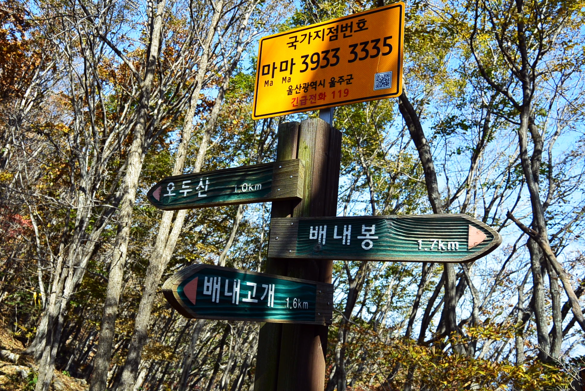 이정표가 있는 삼거리 도착. 오두산 다녀와서 배내봉으로 가려고 한다