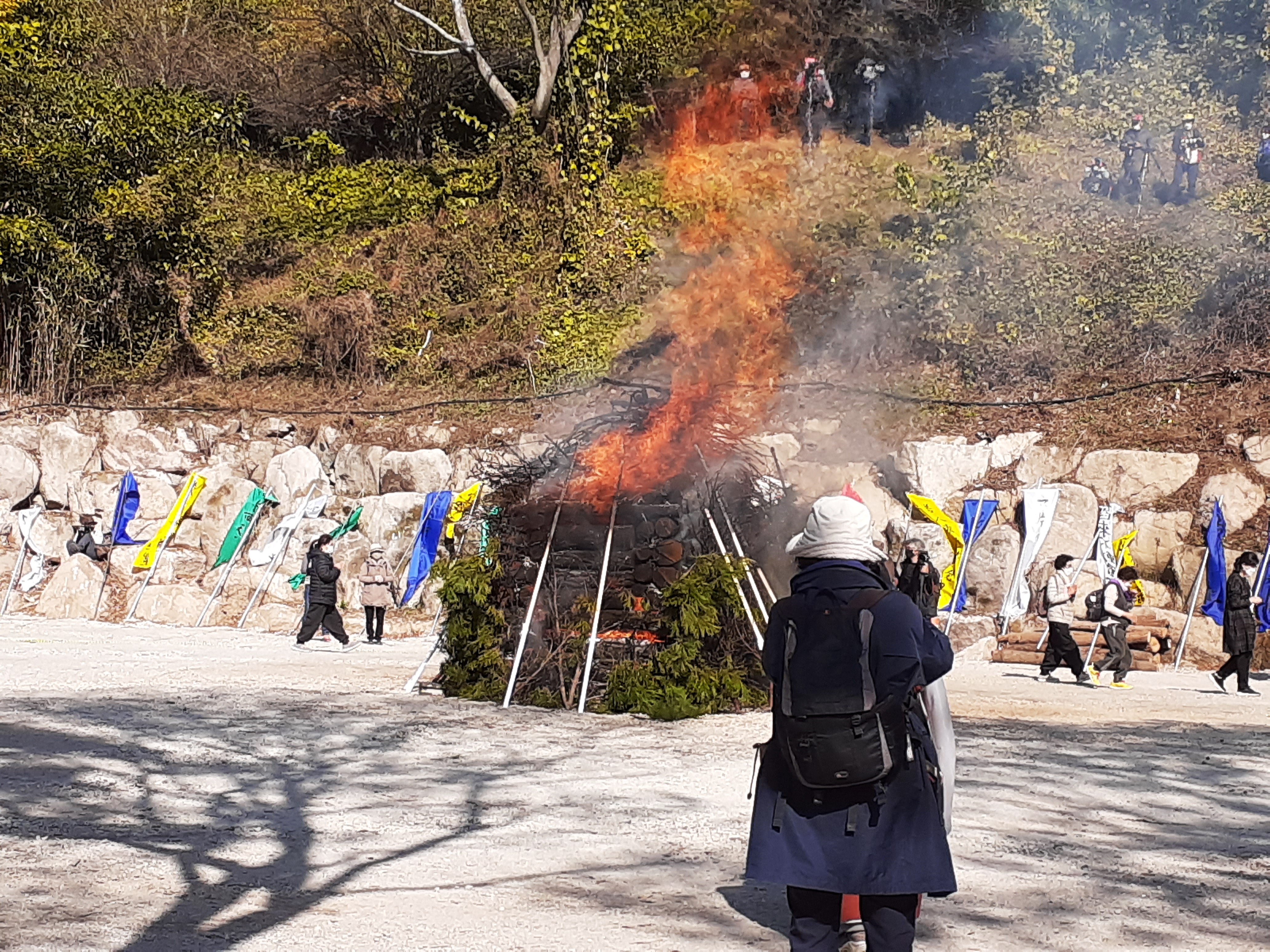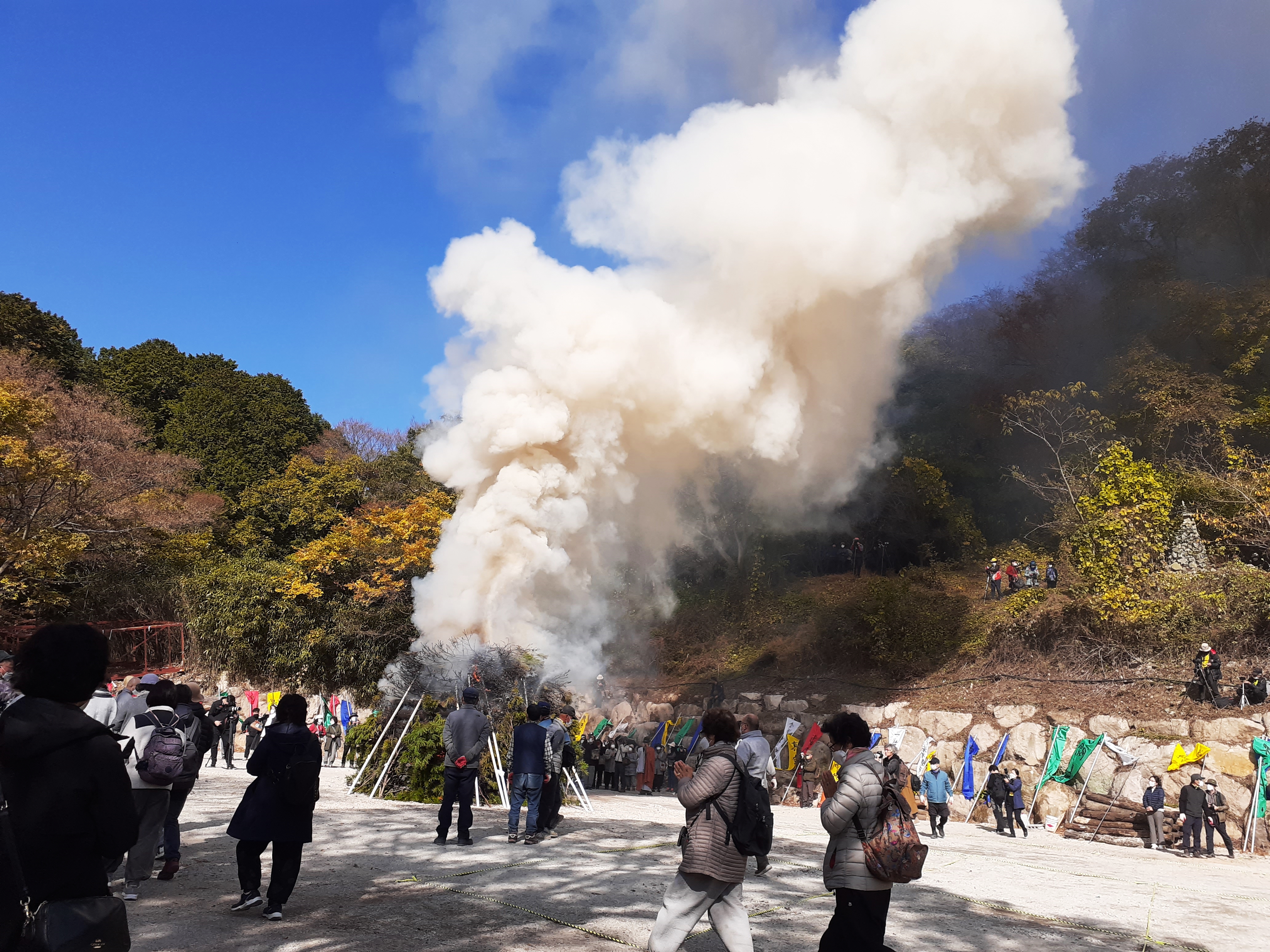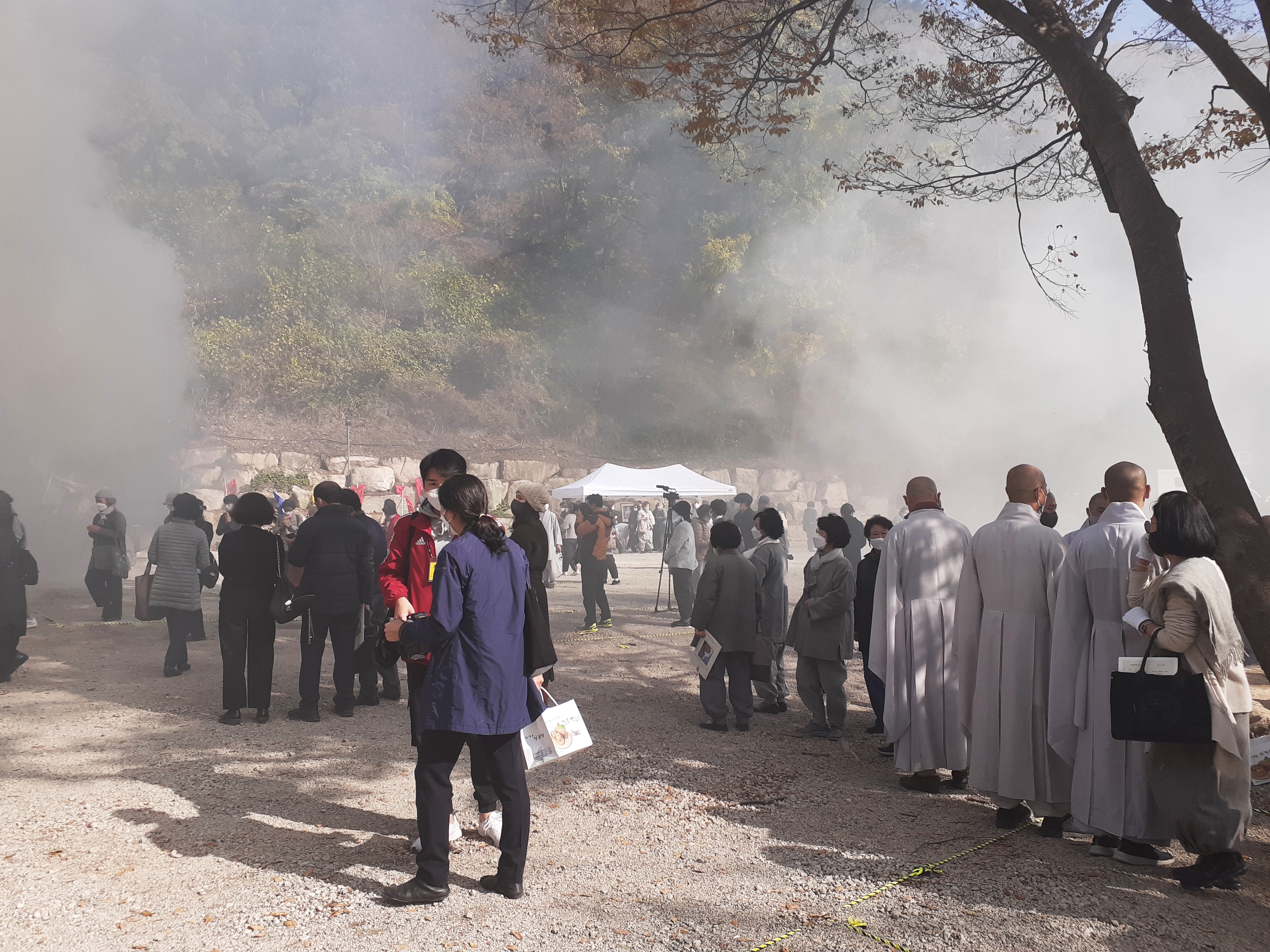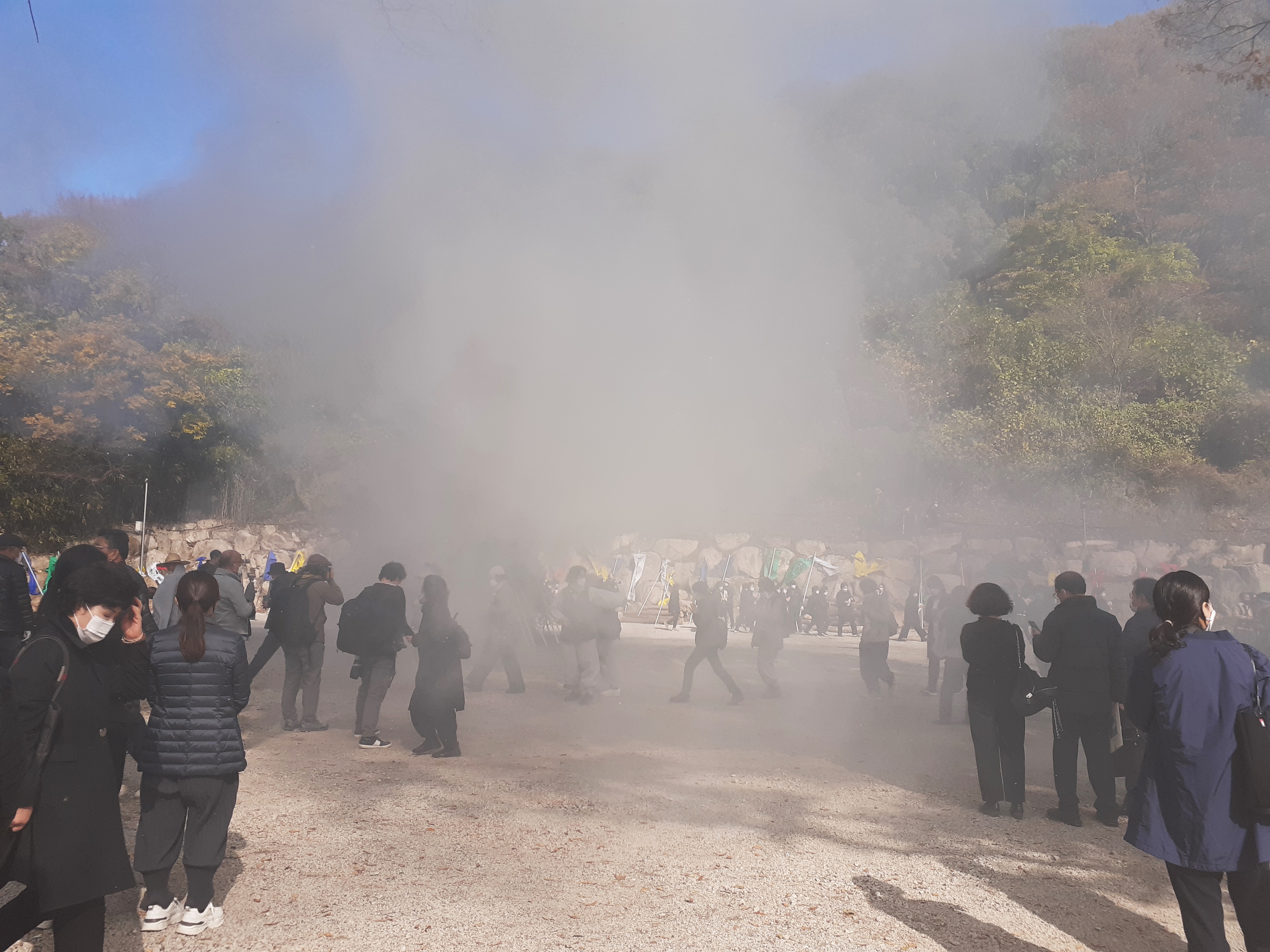 걸어 올라가는데 연기가 자욱하게 올라가고 있다