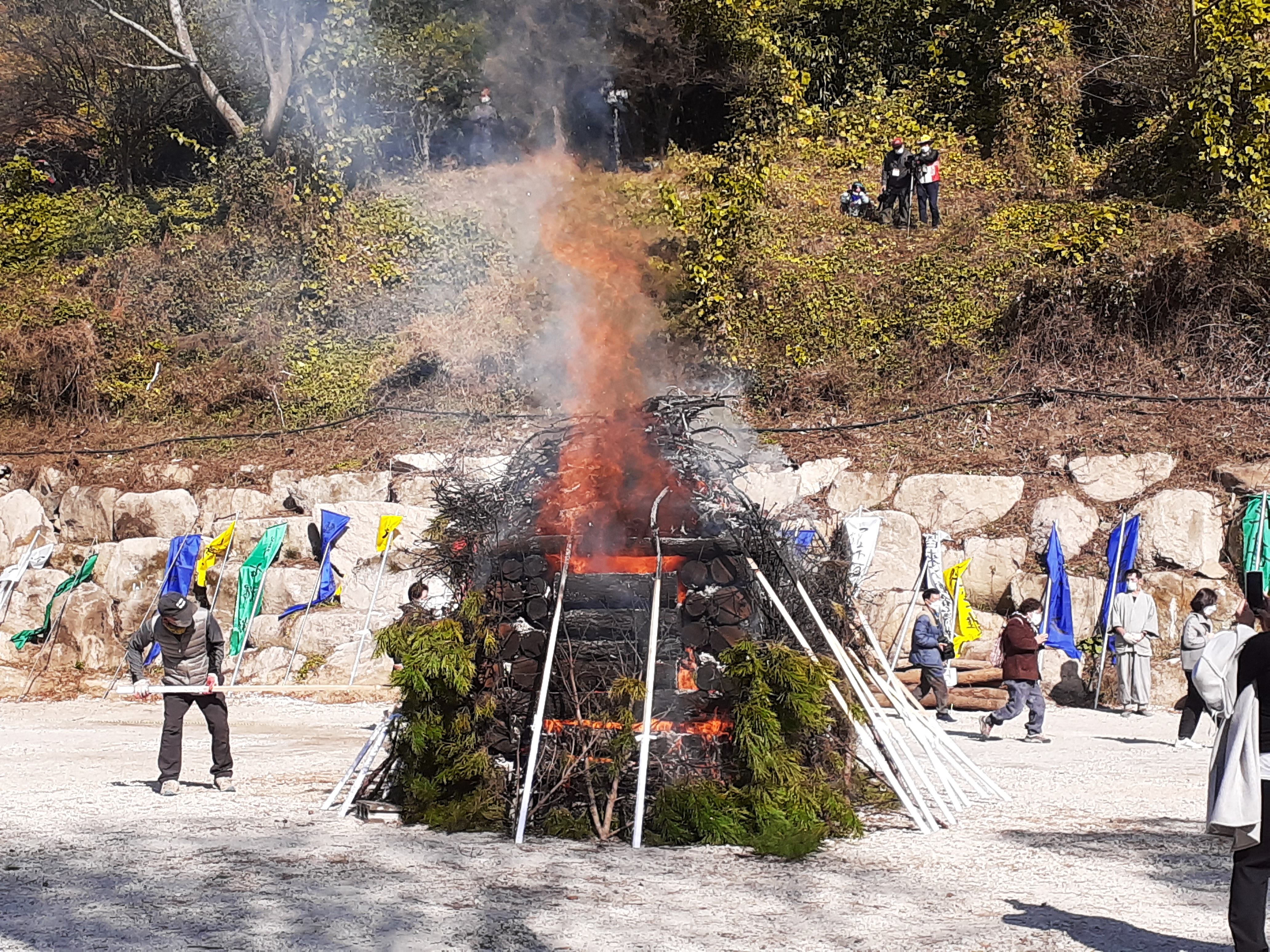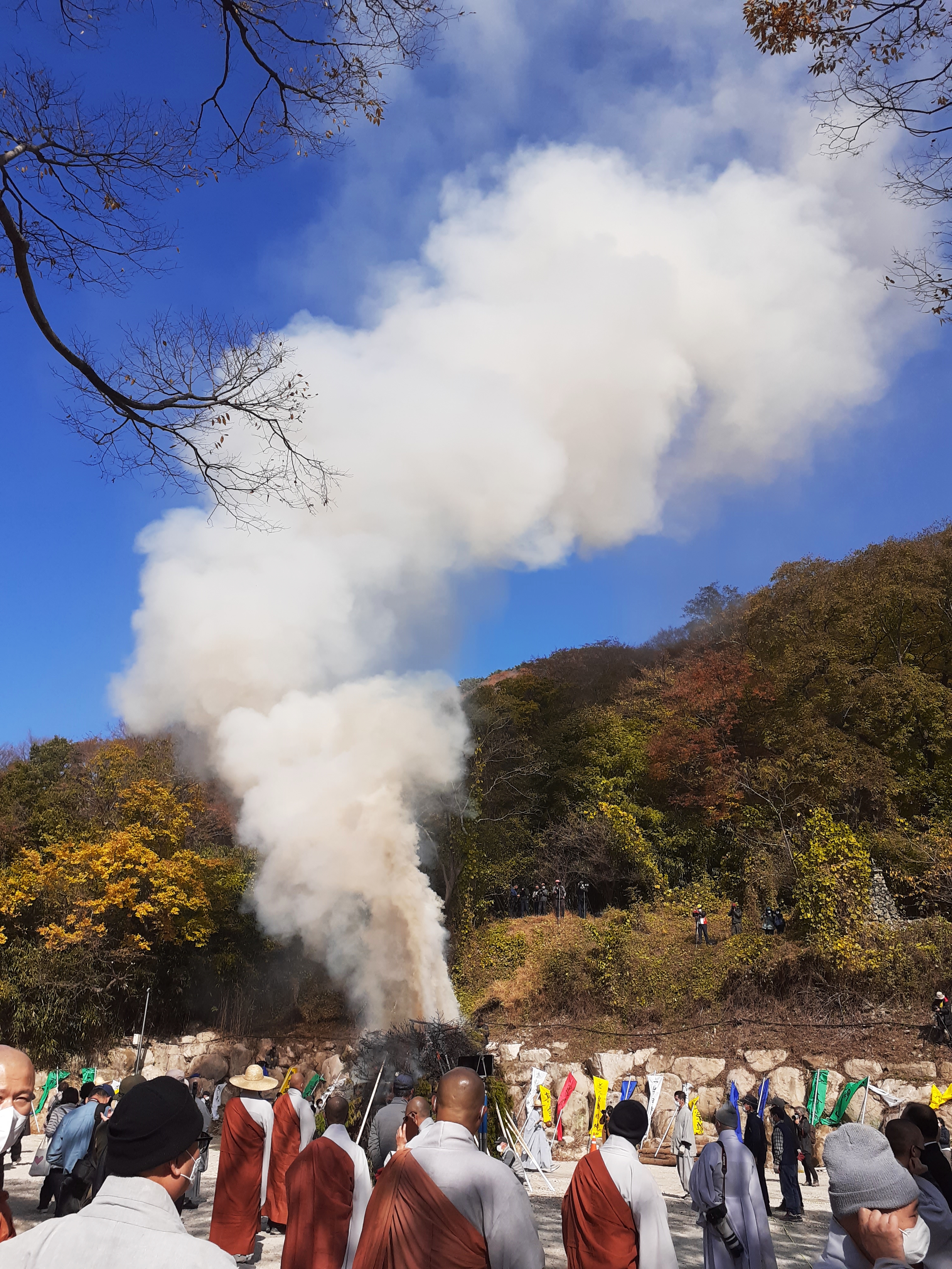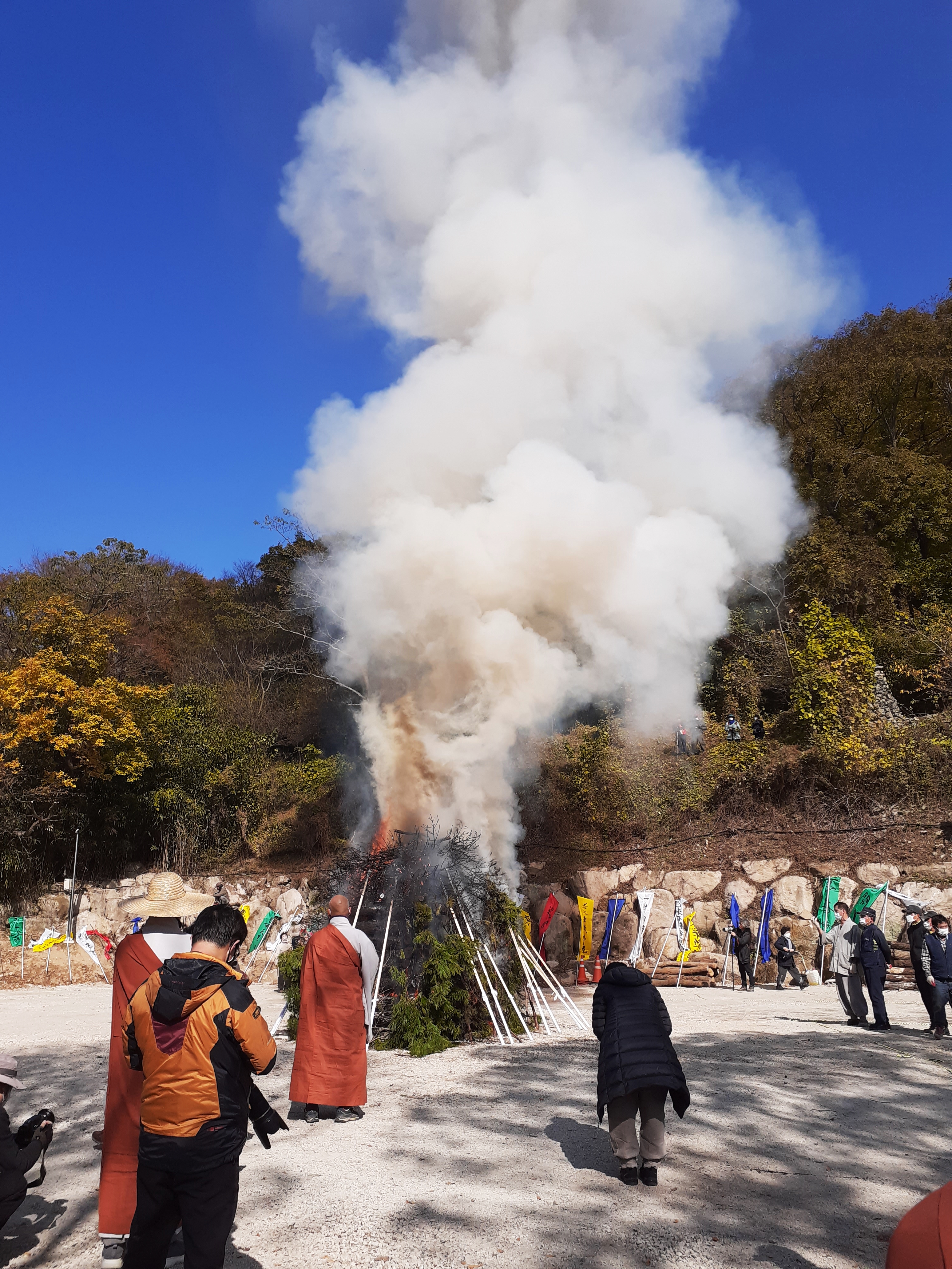 생솔가지를 덮어놓으니 연기가 하늘로 치솟고 있었고, 우리는 합장부터 하였다