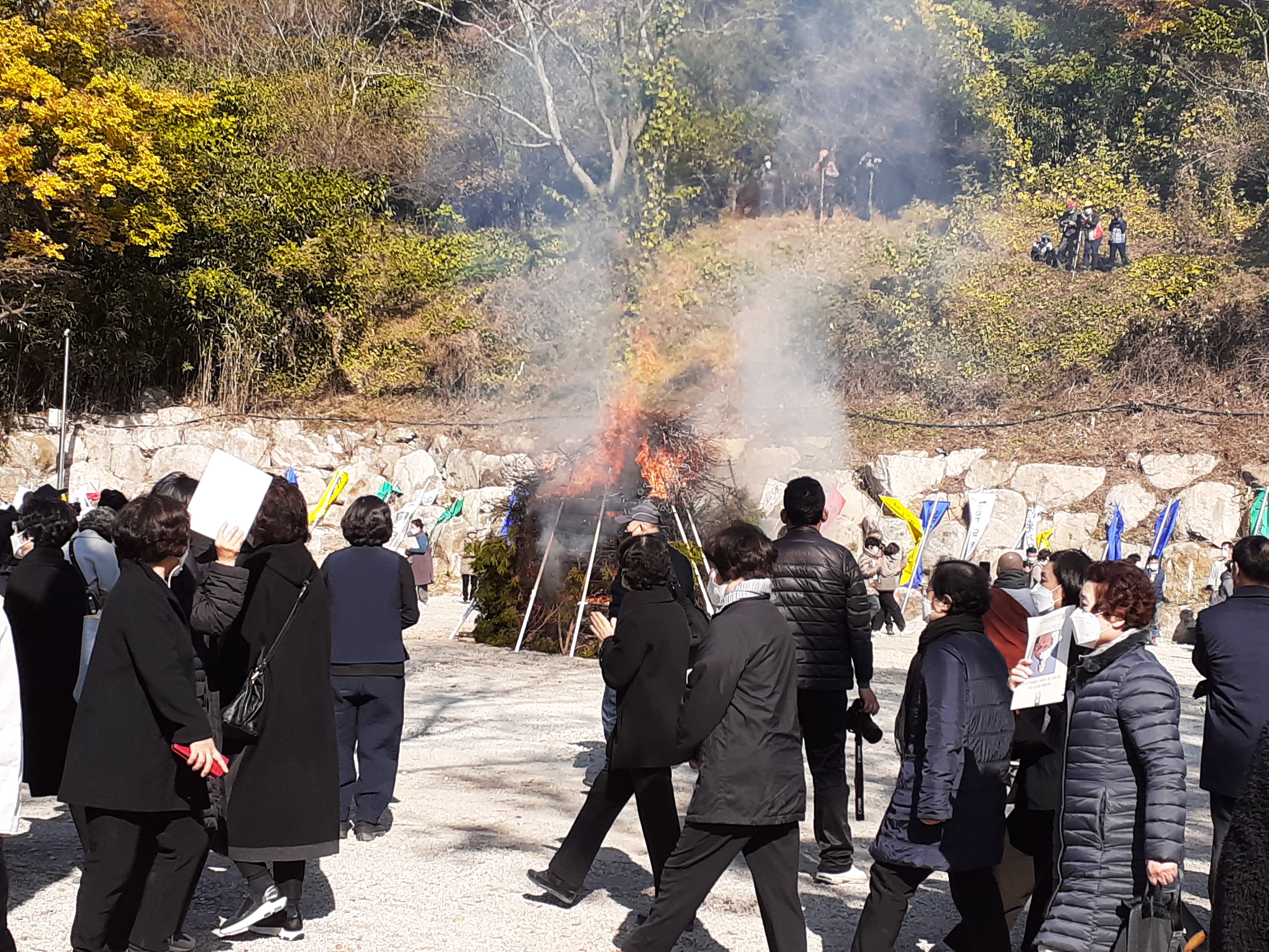 가보자. 역시 다비식이었다. 많은 스님들과 신도님들과 이미 불이 들어가 타고 있는 중이었다