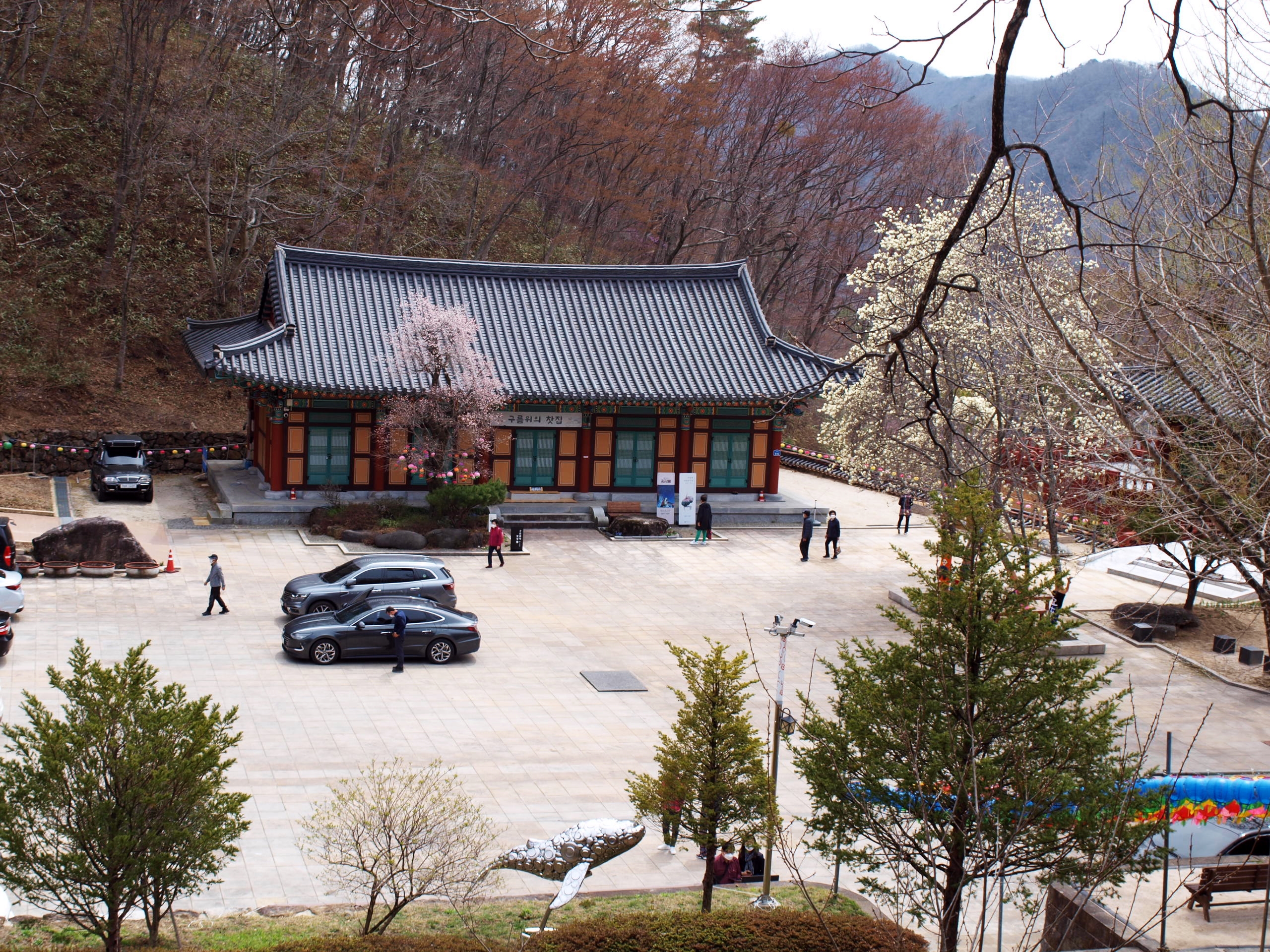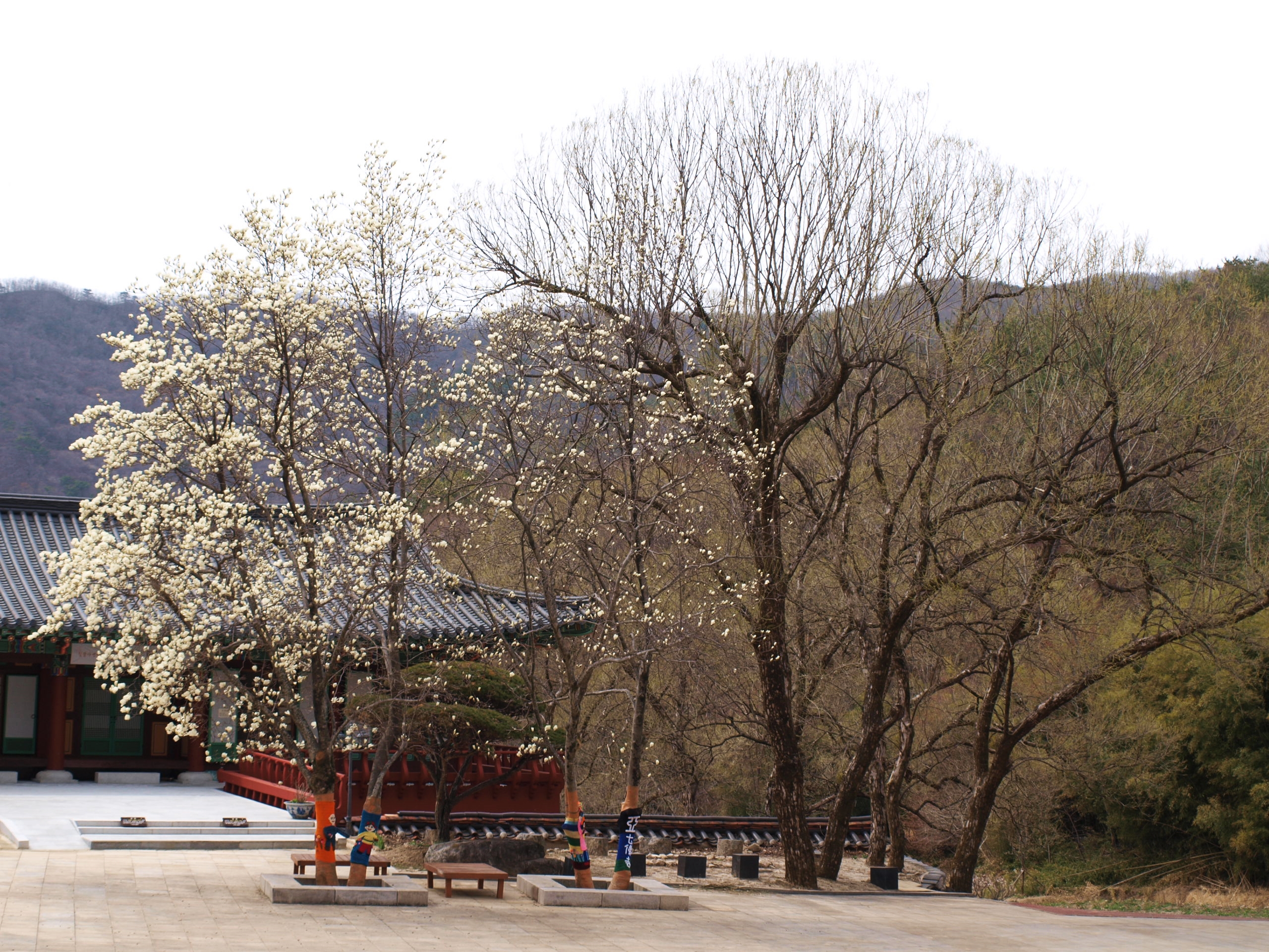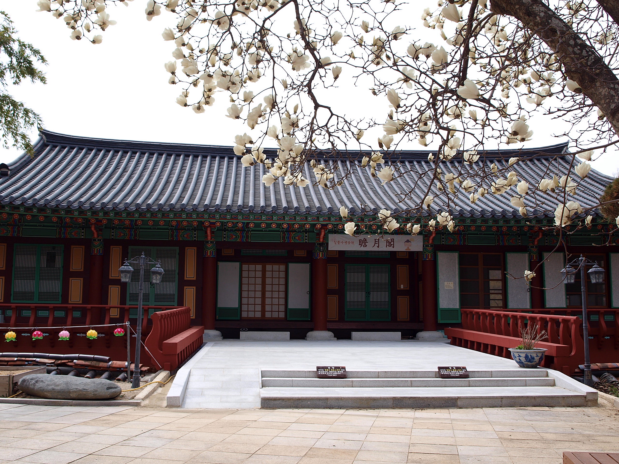 전각앞에 목련꽃이 이제야 피고있어 해발이 높고 추운곳이 맞는것 같다