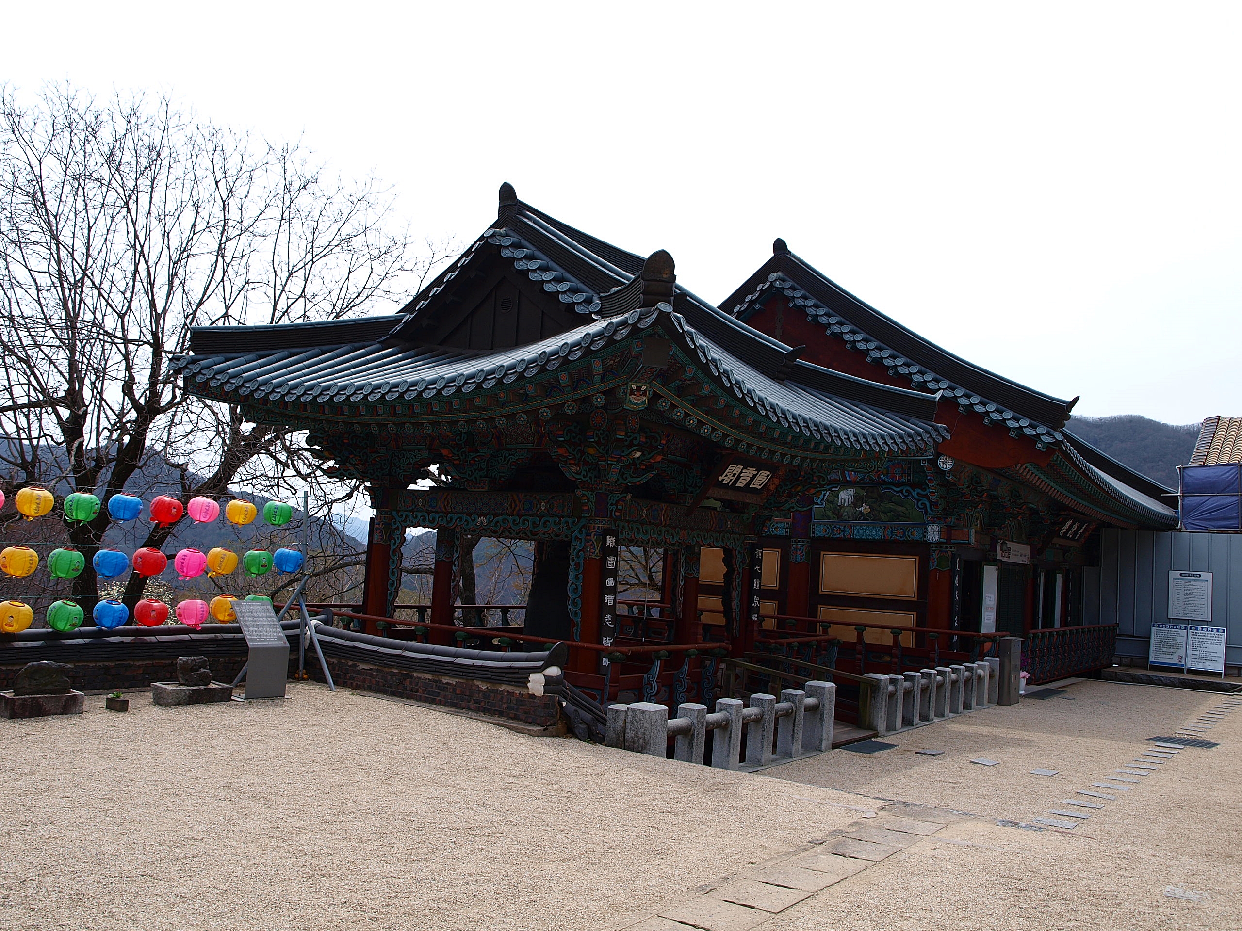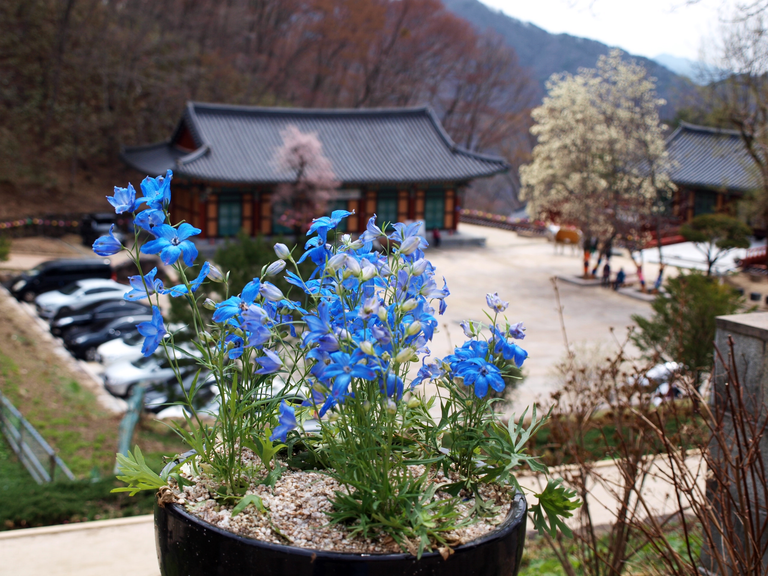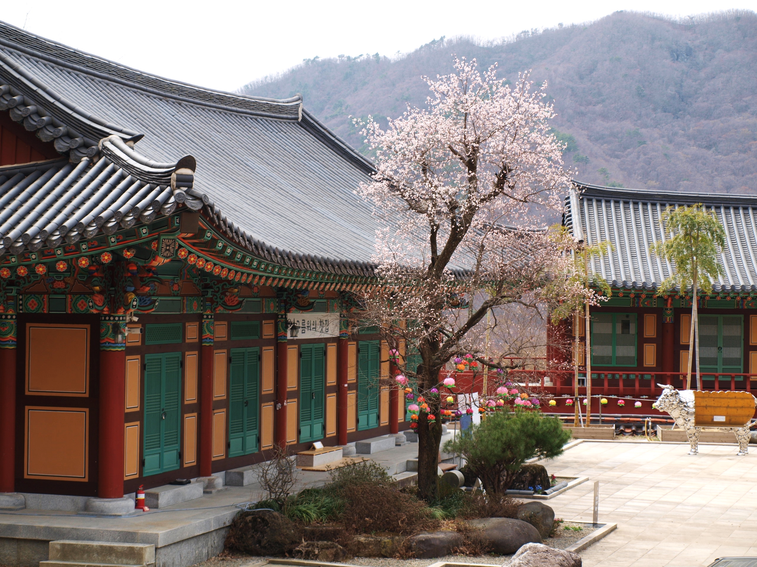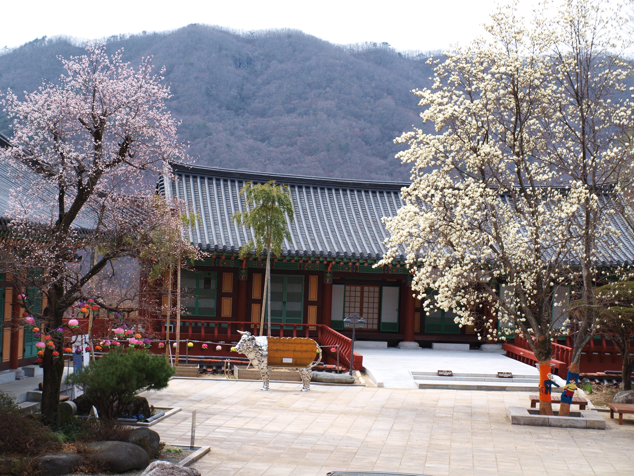 전각앞에 목련꽃이 이제야 피고있어 해발이 높고 추운곳이 맞는것 같다