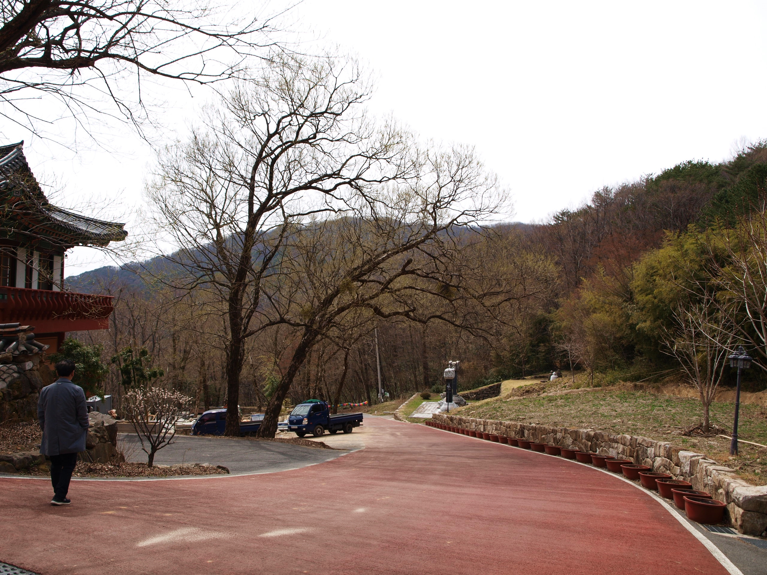 계곡따라 피어있는 복사꽃이 진분홍으로 화려하게 피어있고, 달리는 차도로 가로수와 산에는 벗꽃이 군데군데 피어있어 겨울의 회색빛에 꽃이 피어있어 화사하면서 분위기가 걸어서 가고싶다는 생각을 하게 한다. 하동녹차는 시배지가 있을 정도의 오래된 역사가 깊은 곳이라 올라가는 길에 찻집과 펜션이 즐비하게 계곡을 따라 이어져 있었다. 계곡 끝을 지나고도 구불구불 산 허리를 돌아 가서야 '지리산 칠불사' 주차장이 나온다. 주차장은 이곳 아니어도 칠불사까지 올라가면 주차장이 있다. 걷기 싫어하는 사람들은 칠불사까지 올라가도 된다. 우리는 일주문 앞 주차장에 주차하고 가파른 길을 걸어 올라갔다.