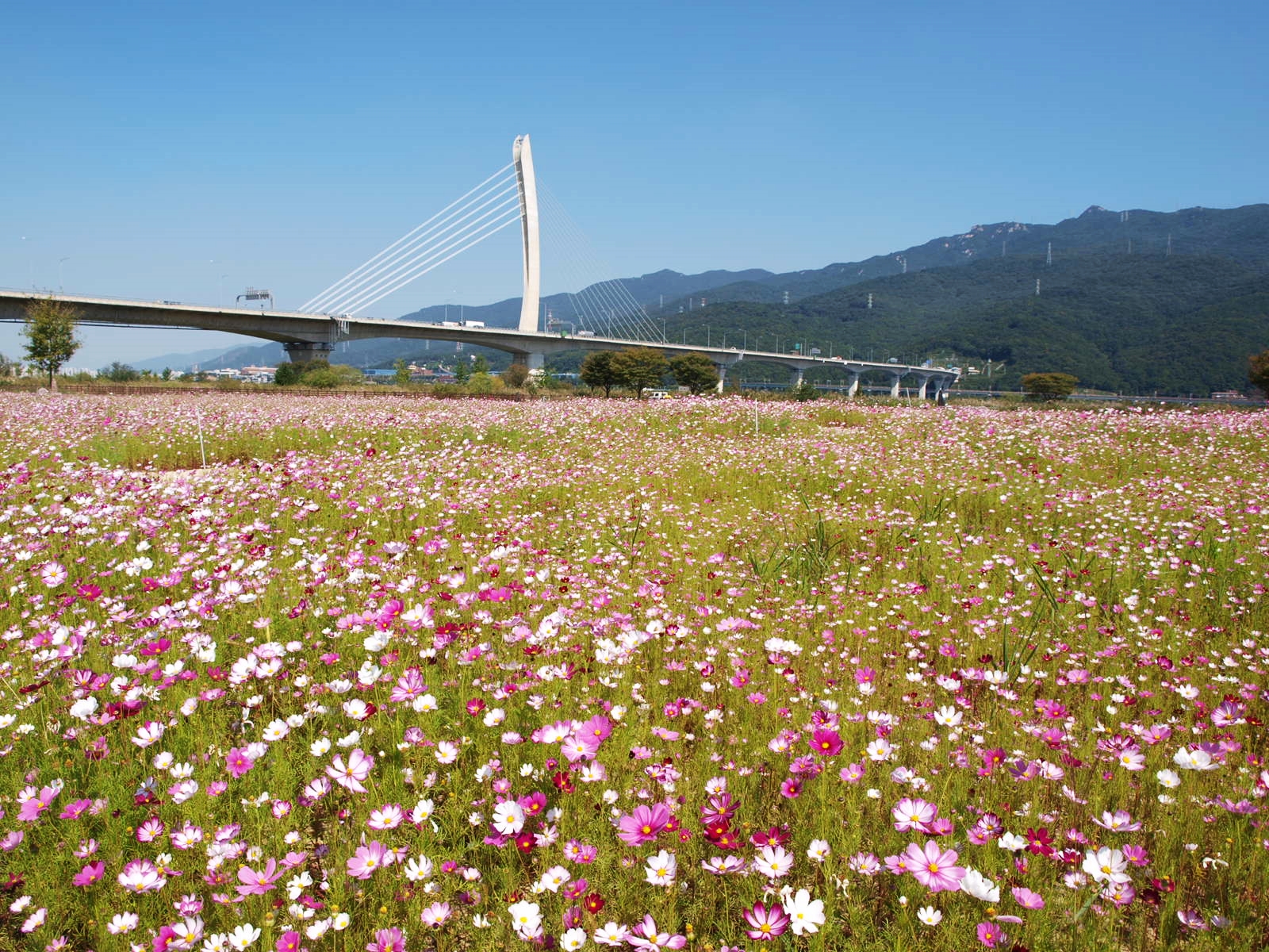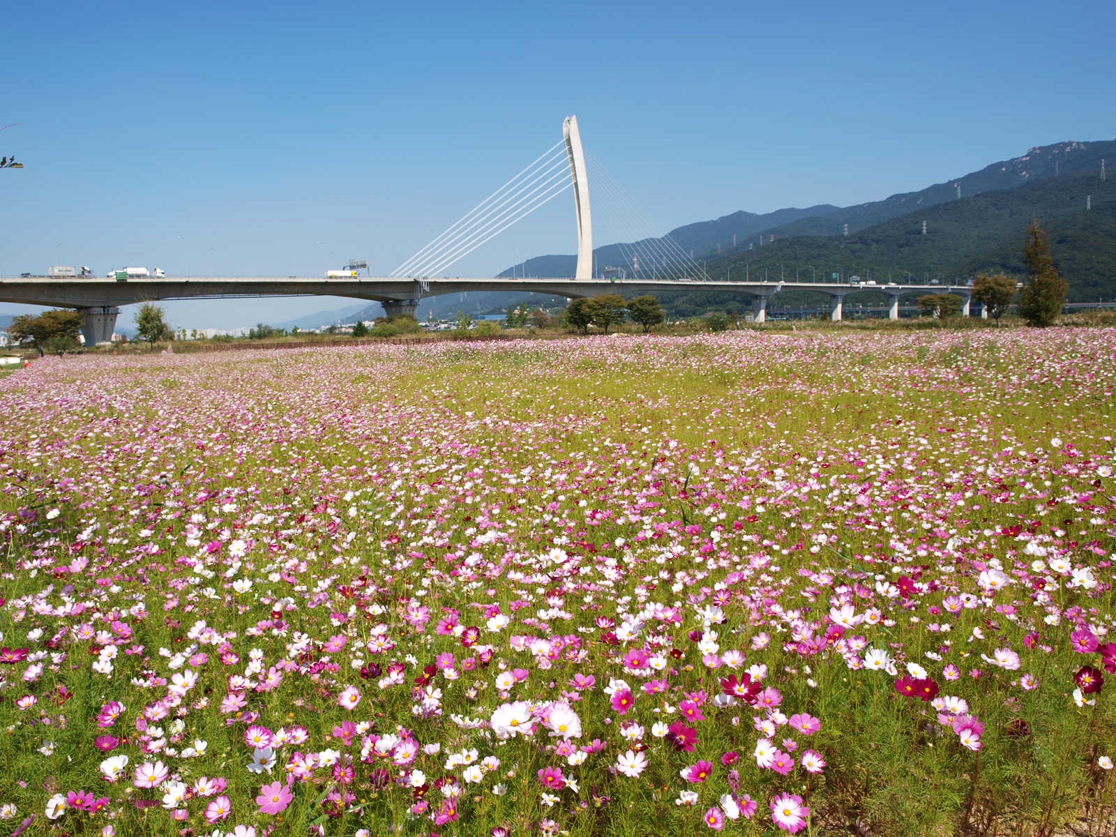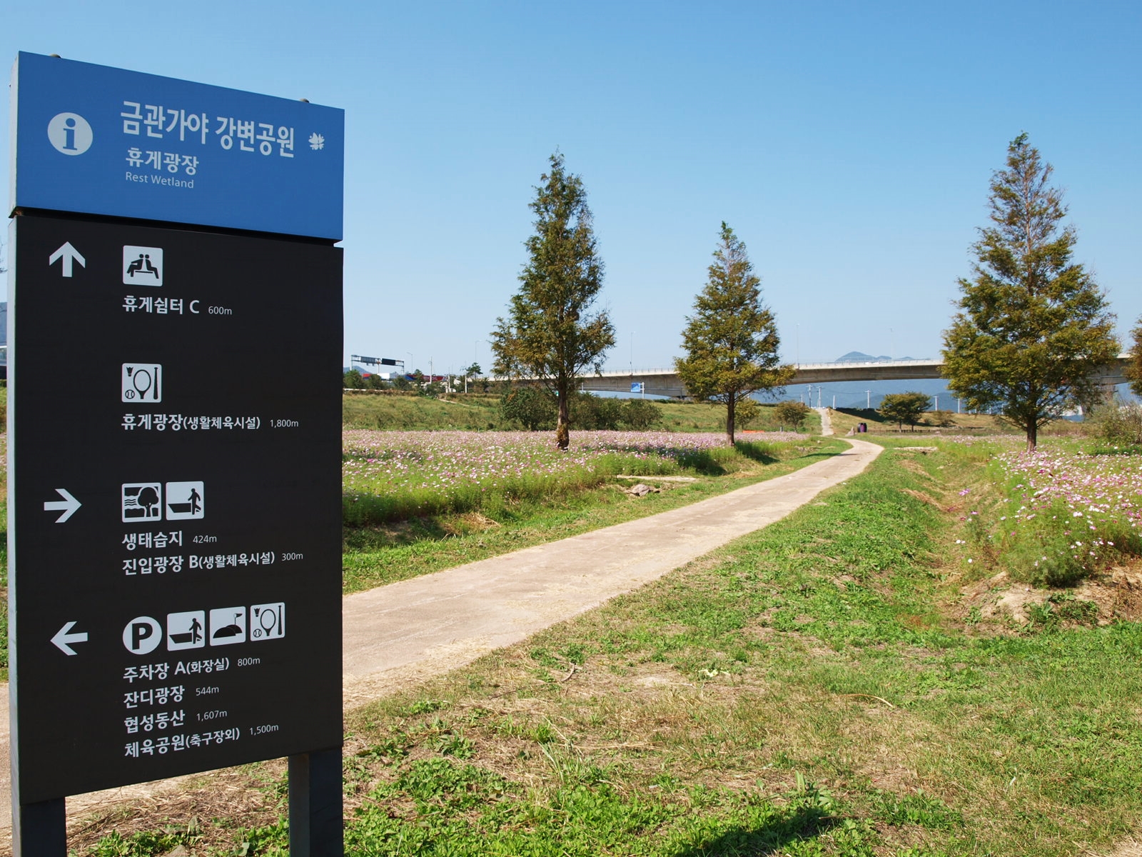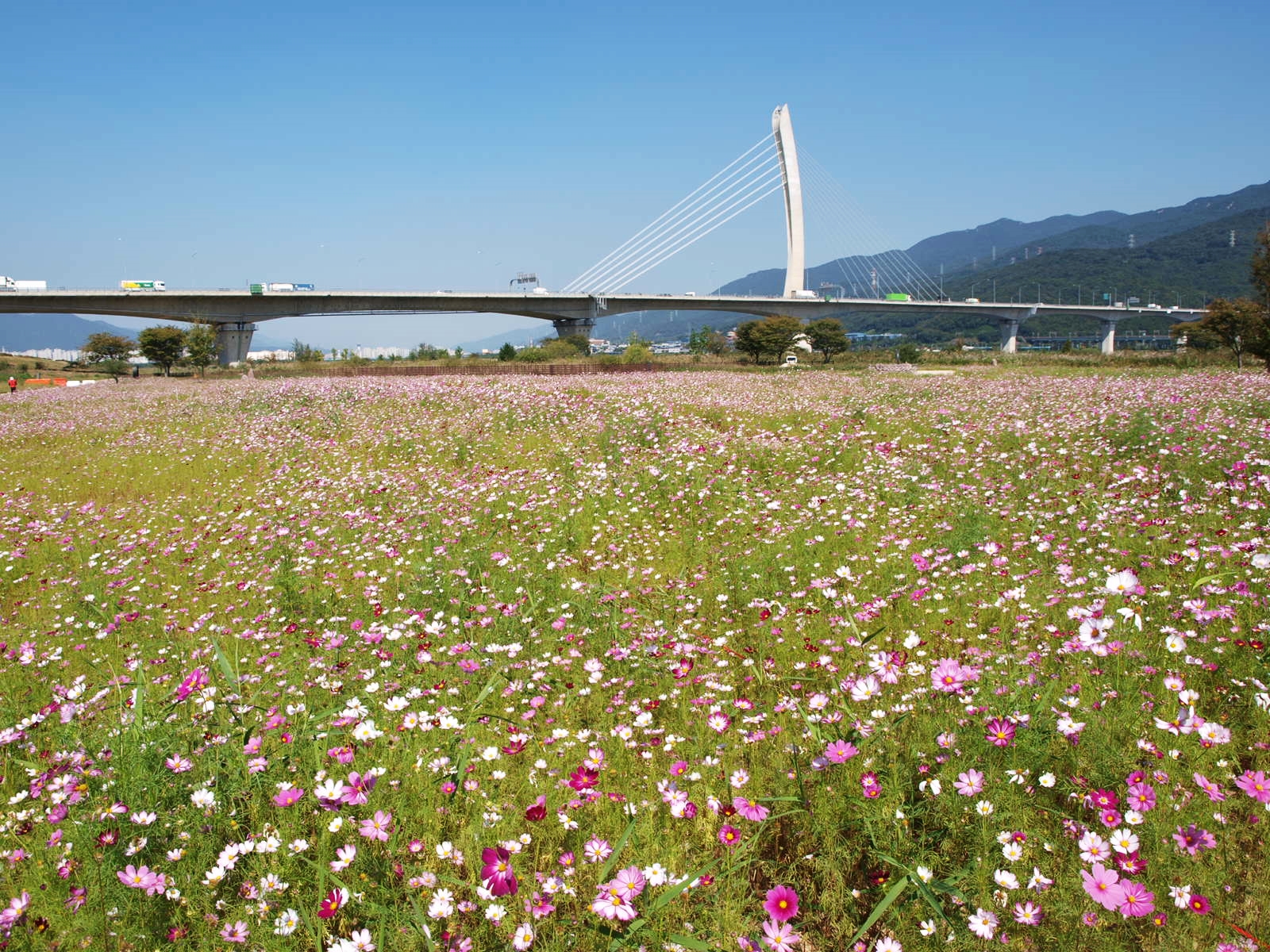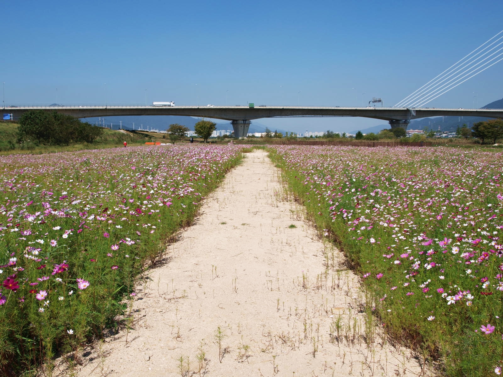 계속 걸어갔더니 강변에 코스모스 꽃으로 보이는 분홍색 밭이 보이네. ㅋㅋㅋ 야호 ! ~~ 그제서야 기분이 날아갈듯 좋아지는데 .... 위치가 고속도로 금관가야휴게소 바로 뒤 강변에 있었다.
