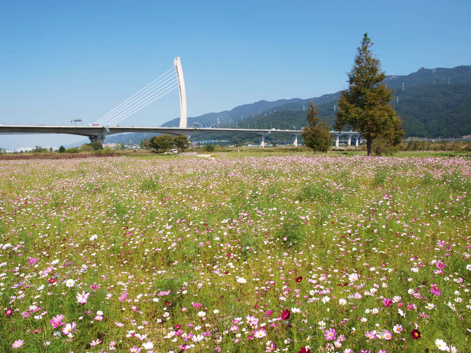 대동생태공원 끝까지 왔는데도 코스모스가 없네. 일단 주차를 하고 강변 뚝방길로 올라섰다