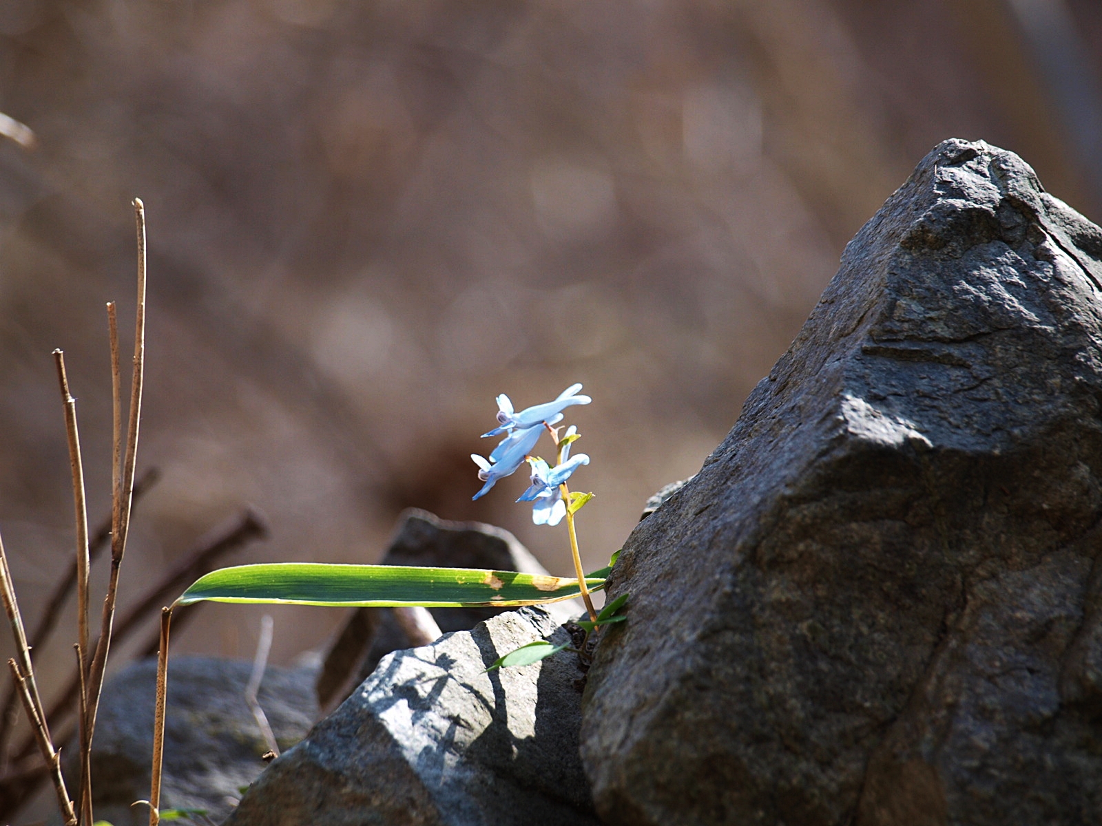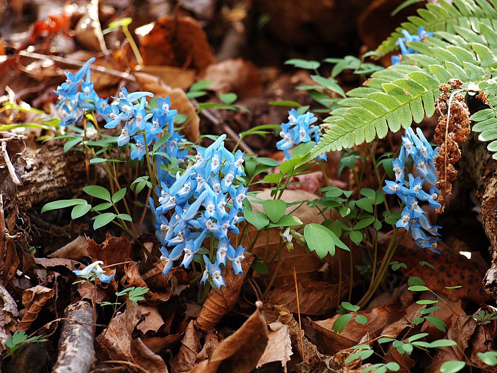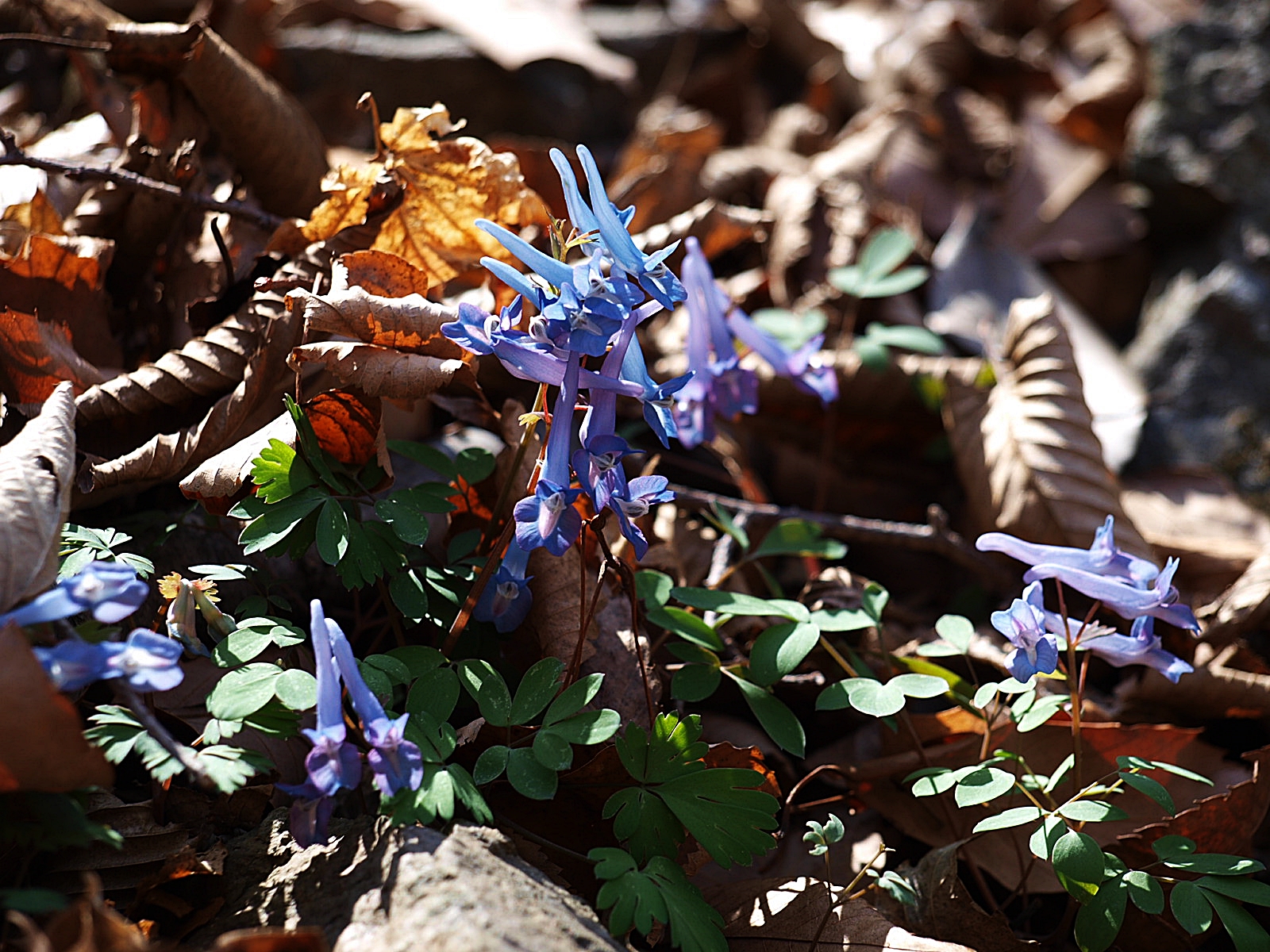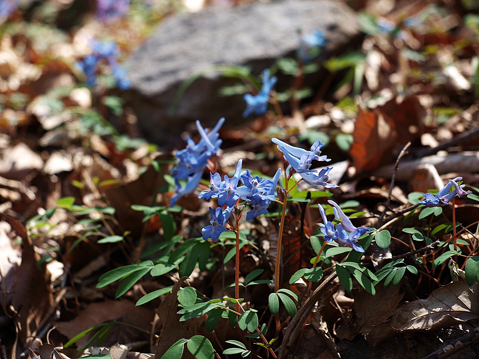 낙엽속에서 고개를 내밀고 핀 현호색 꽃이 감동을 준다