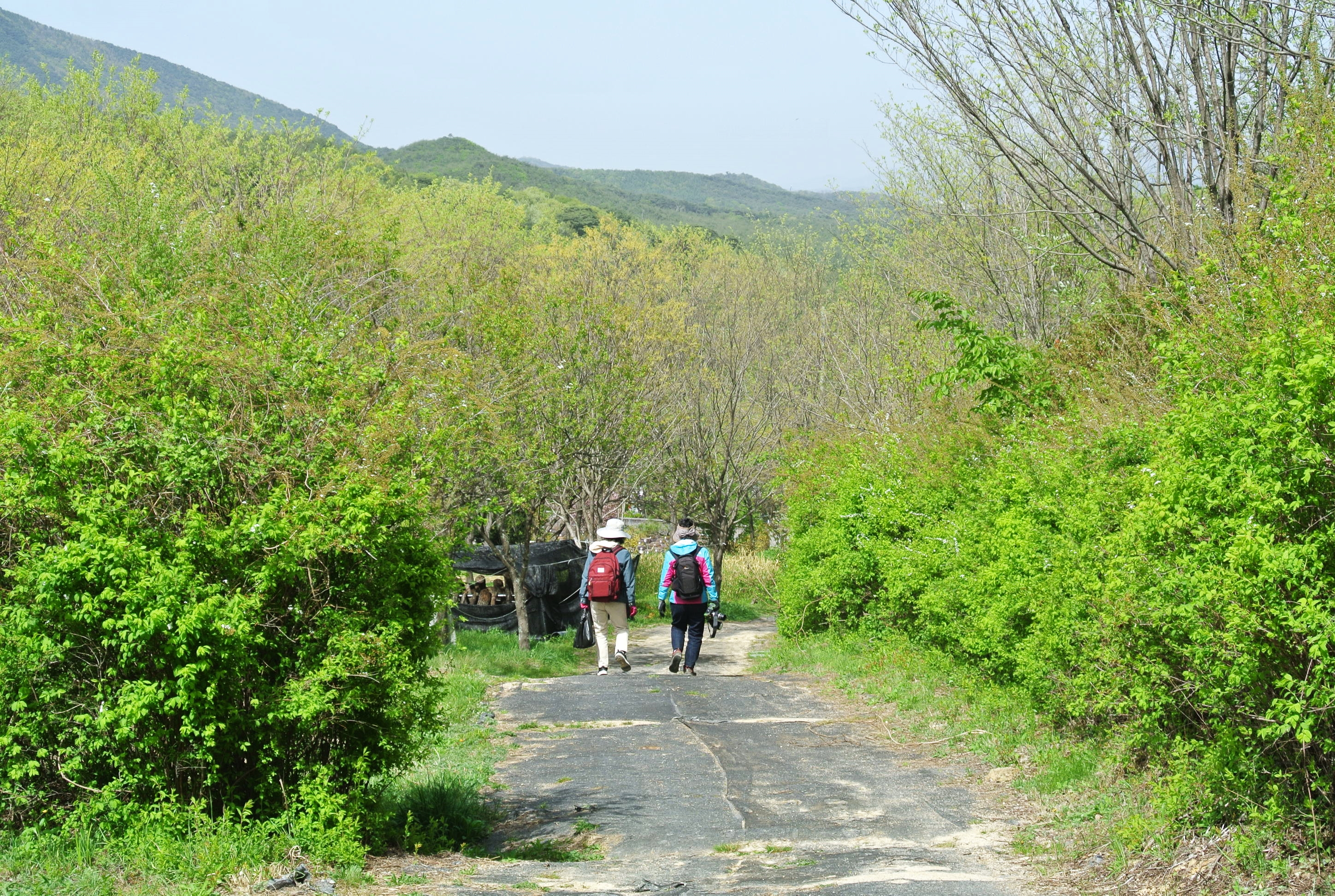 카메라 들고 걸어가는 두 여인 연초록 나무들과 잘 어울린다