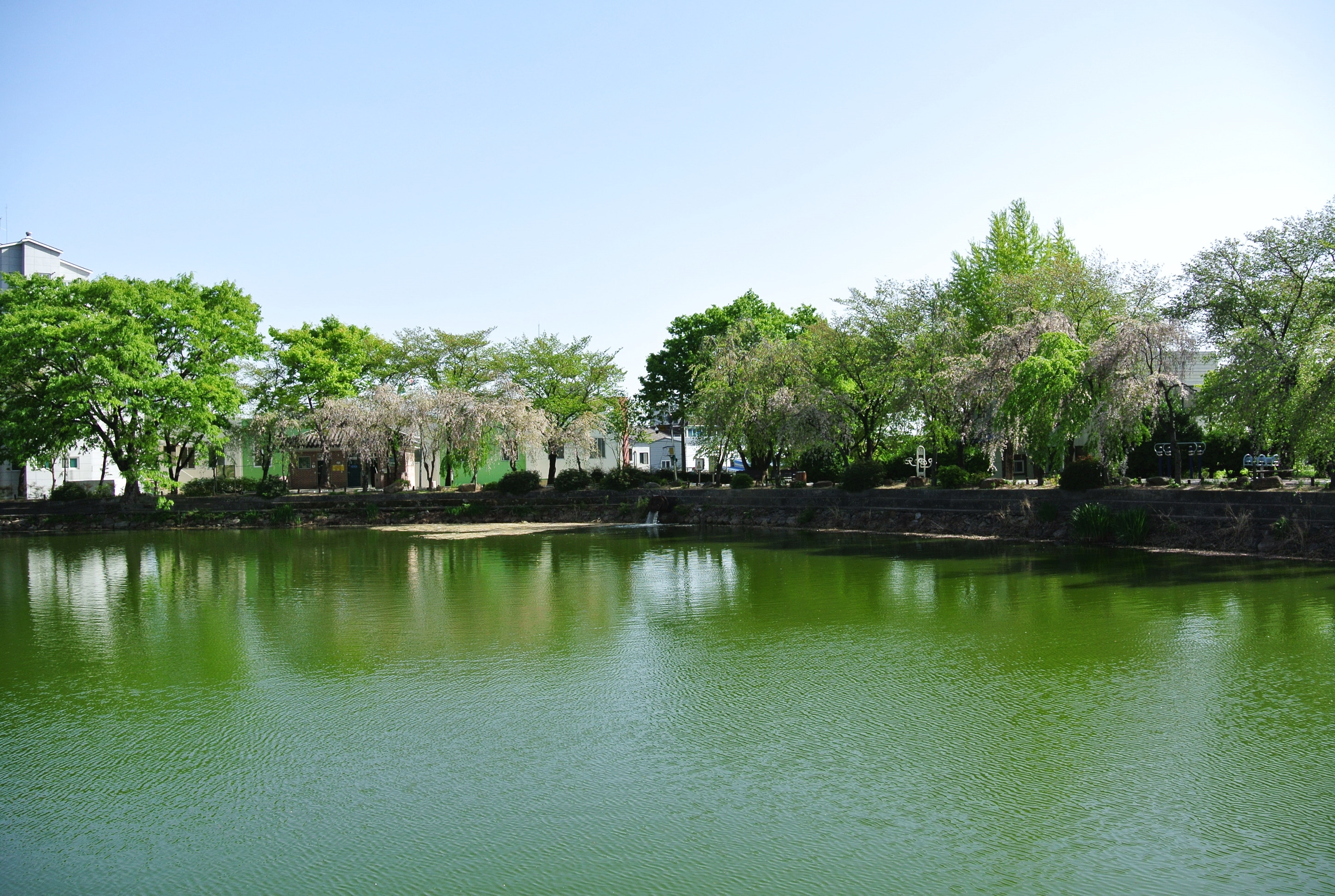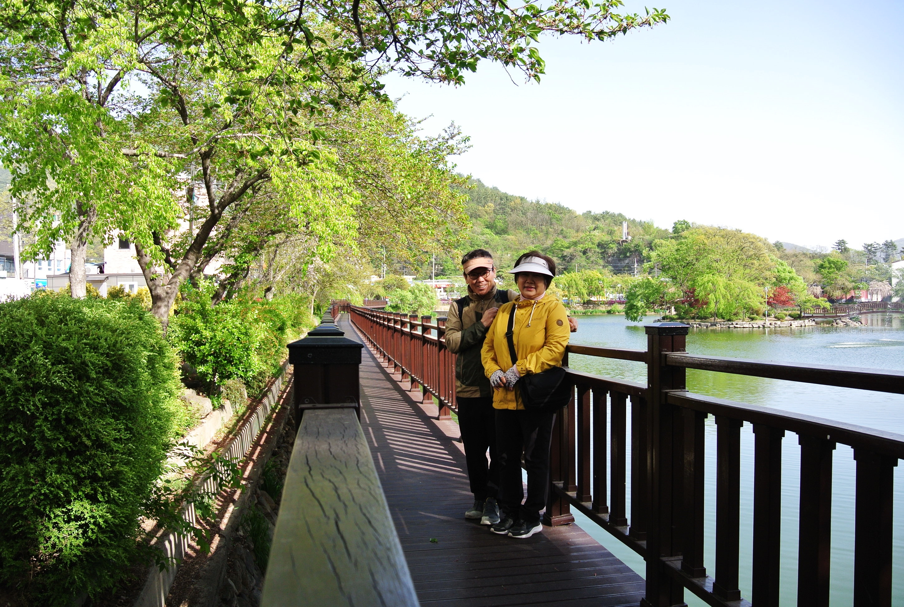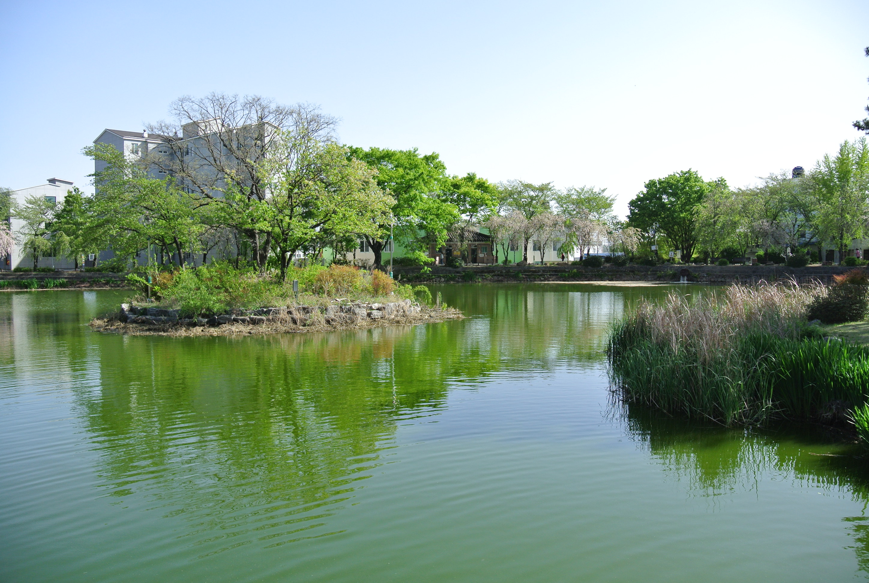 연못가 벤치에 앉아 있는 동네 어르신들이 있어 한가롭게 보였고