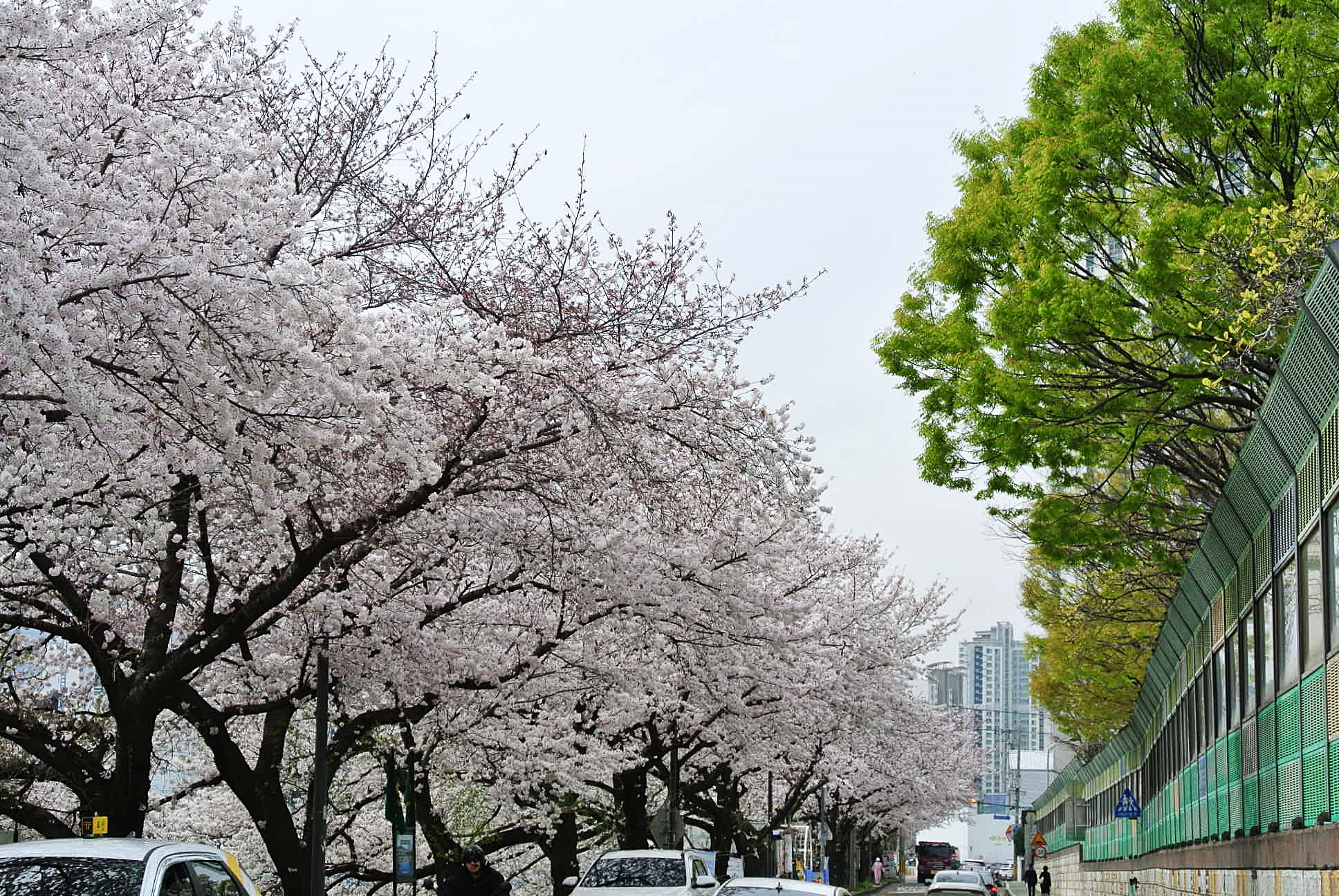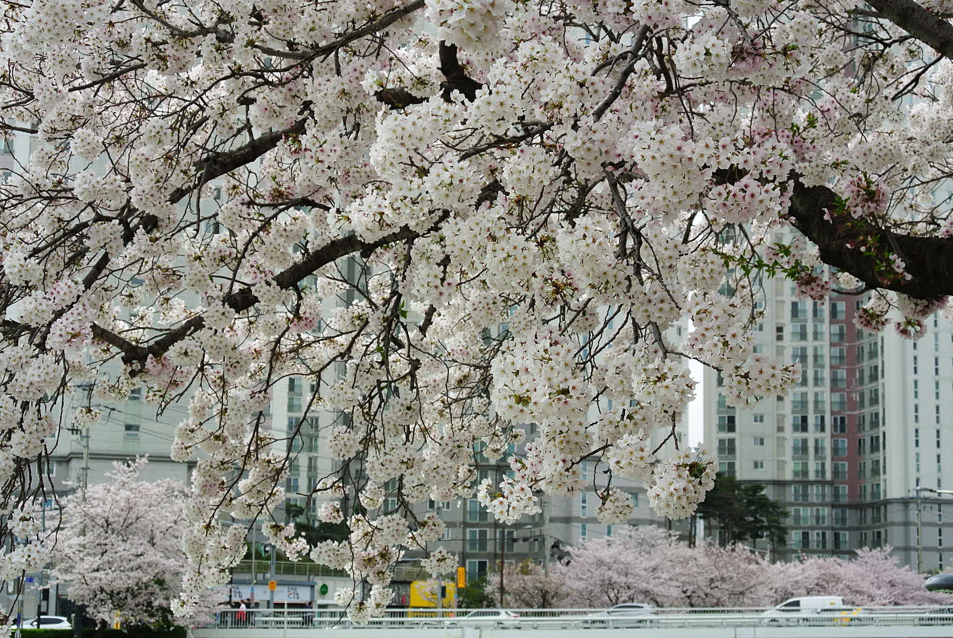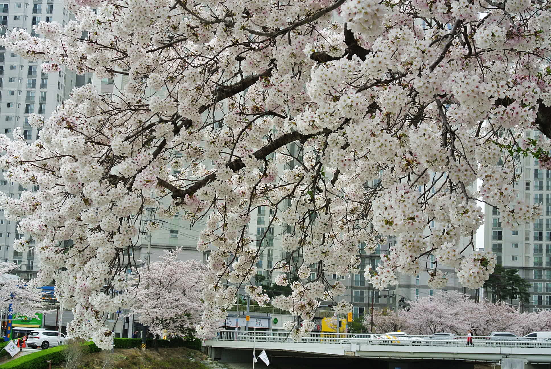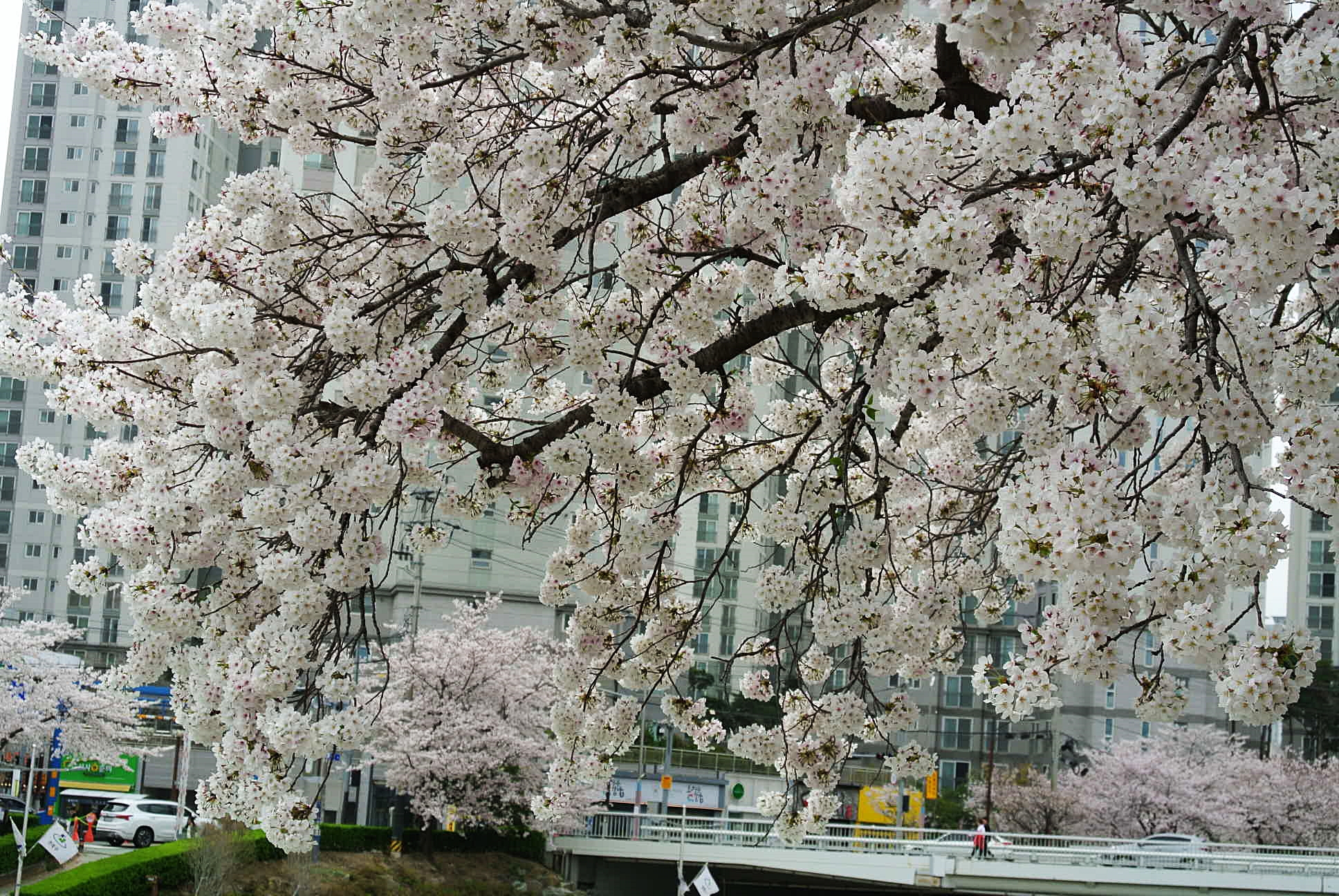 아파트 가로수가 터널을 이루듯 벗꽃이 하얗게 피어 화사함을 더해주니