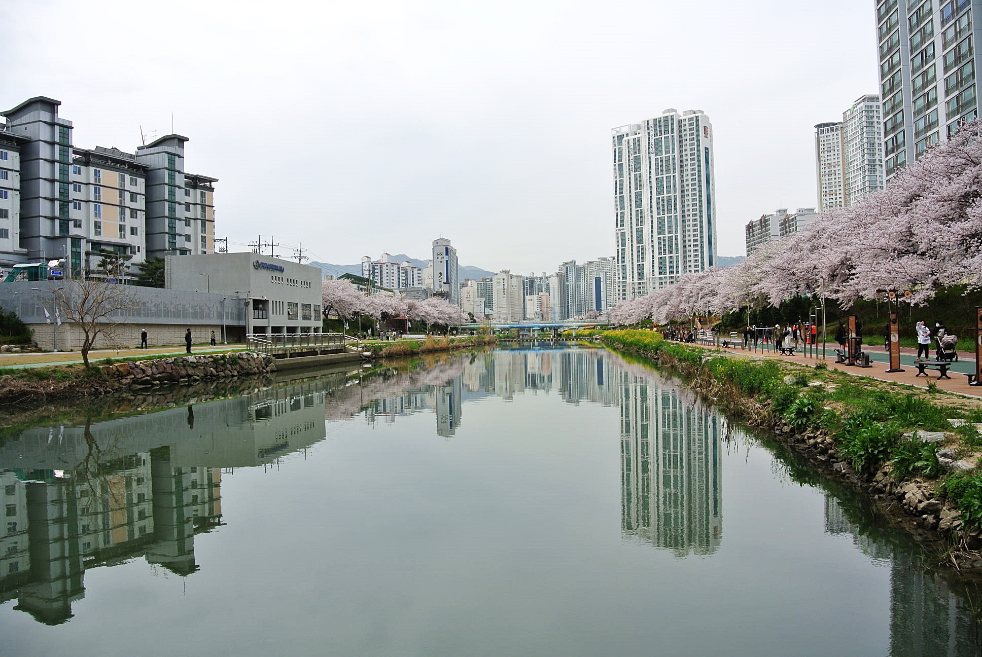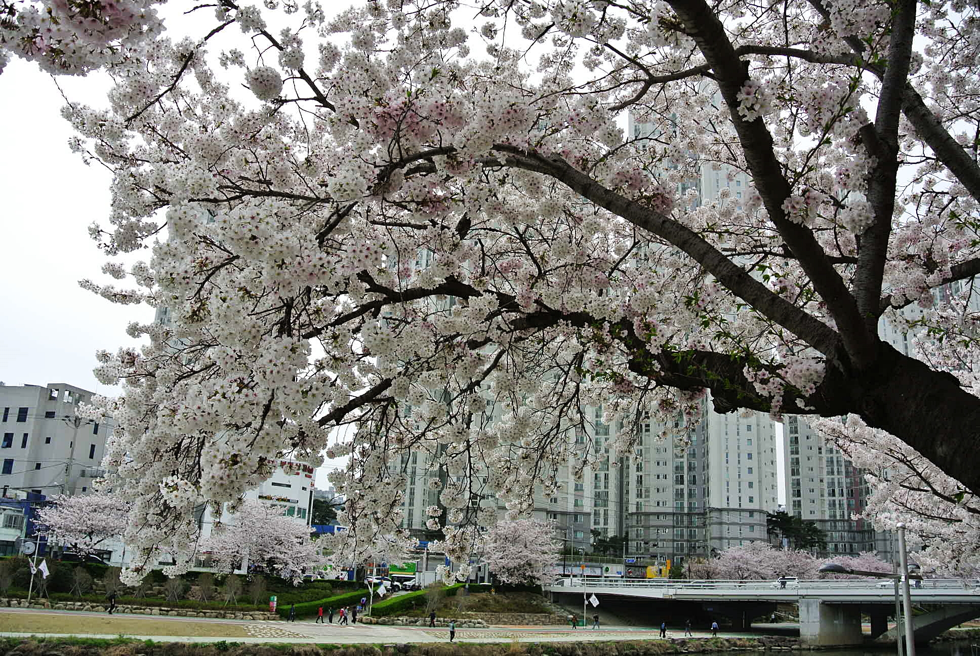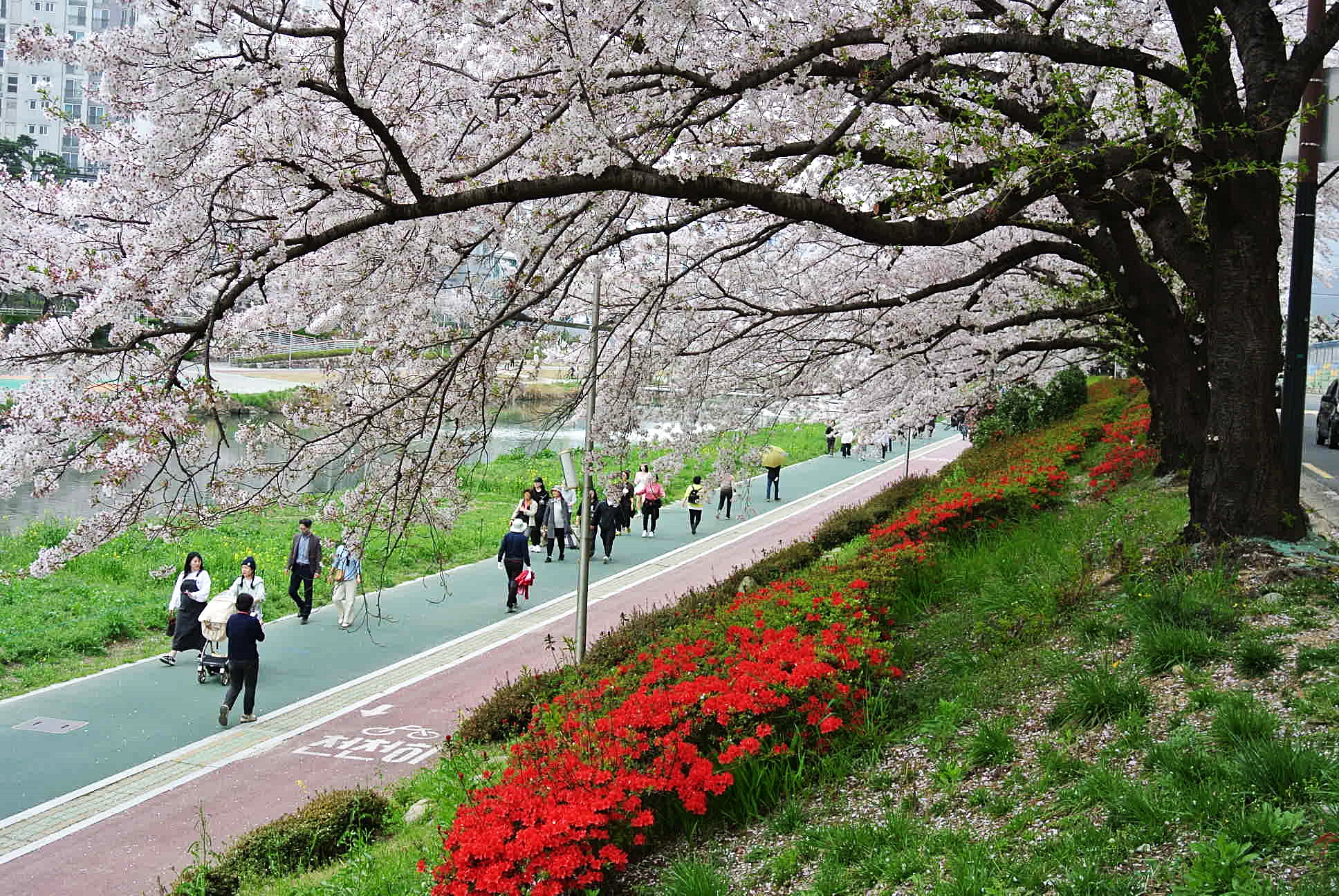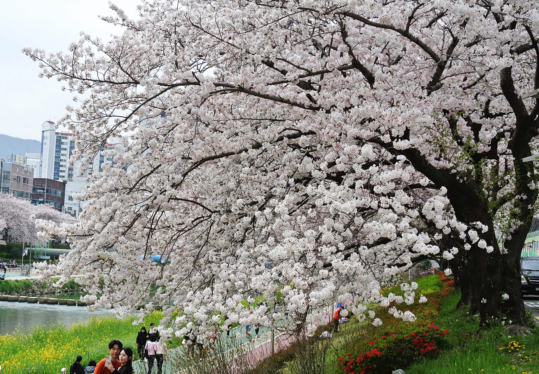 만개하여 절정을 이루고 있는 온천천 벗꽃길 걷는 사람들이 많았다