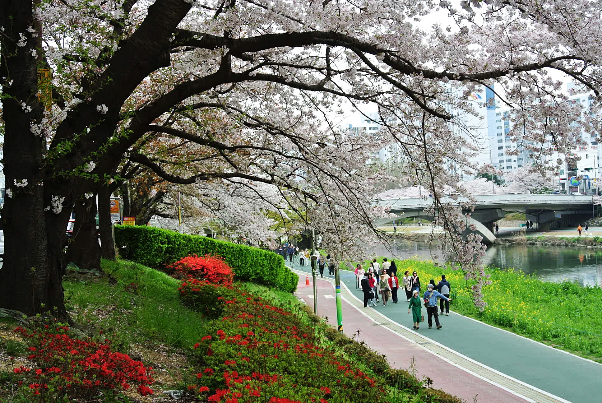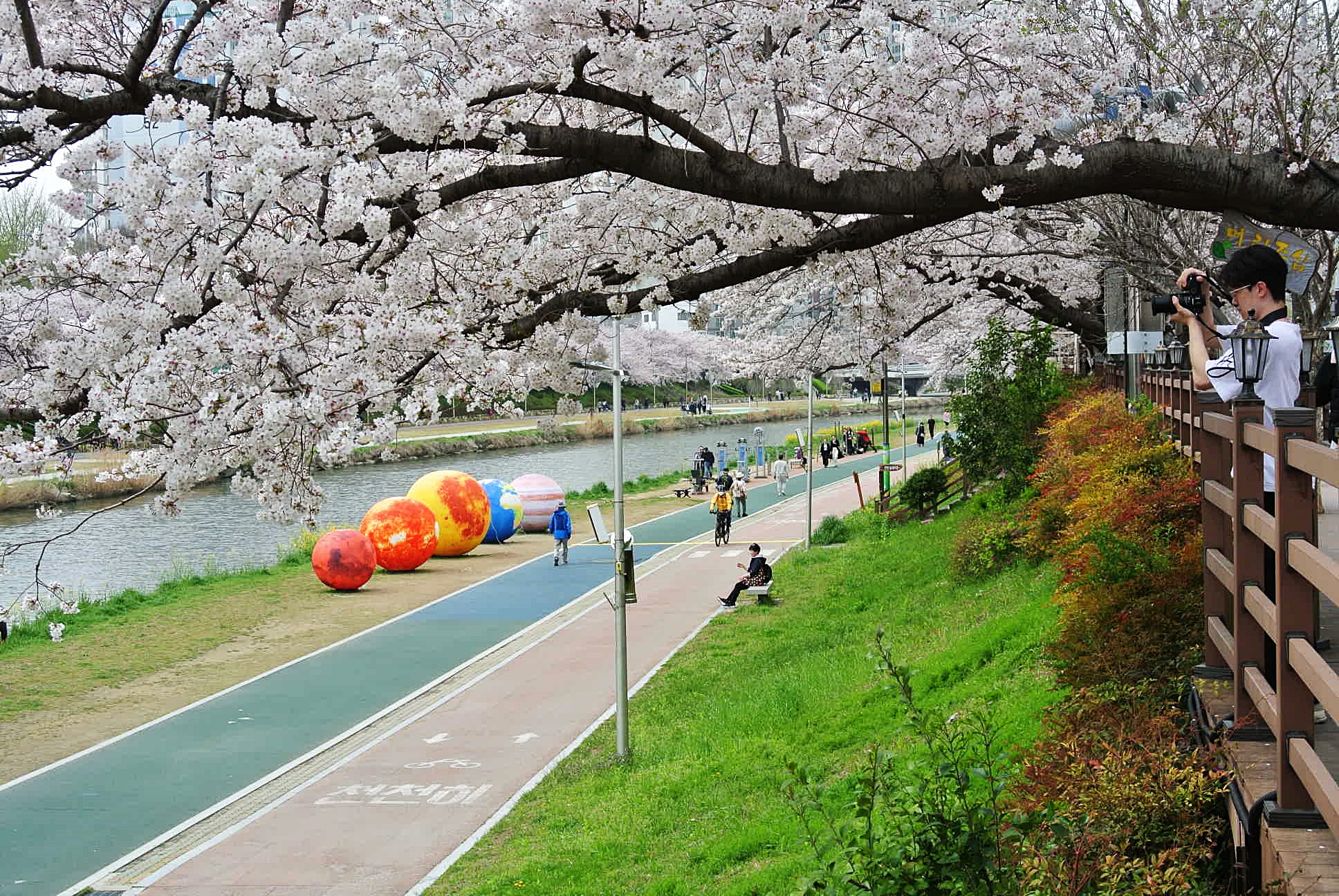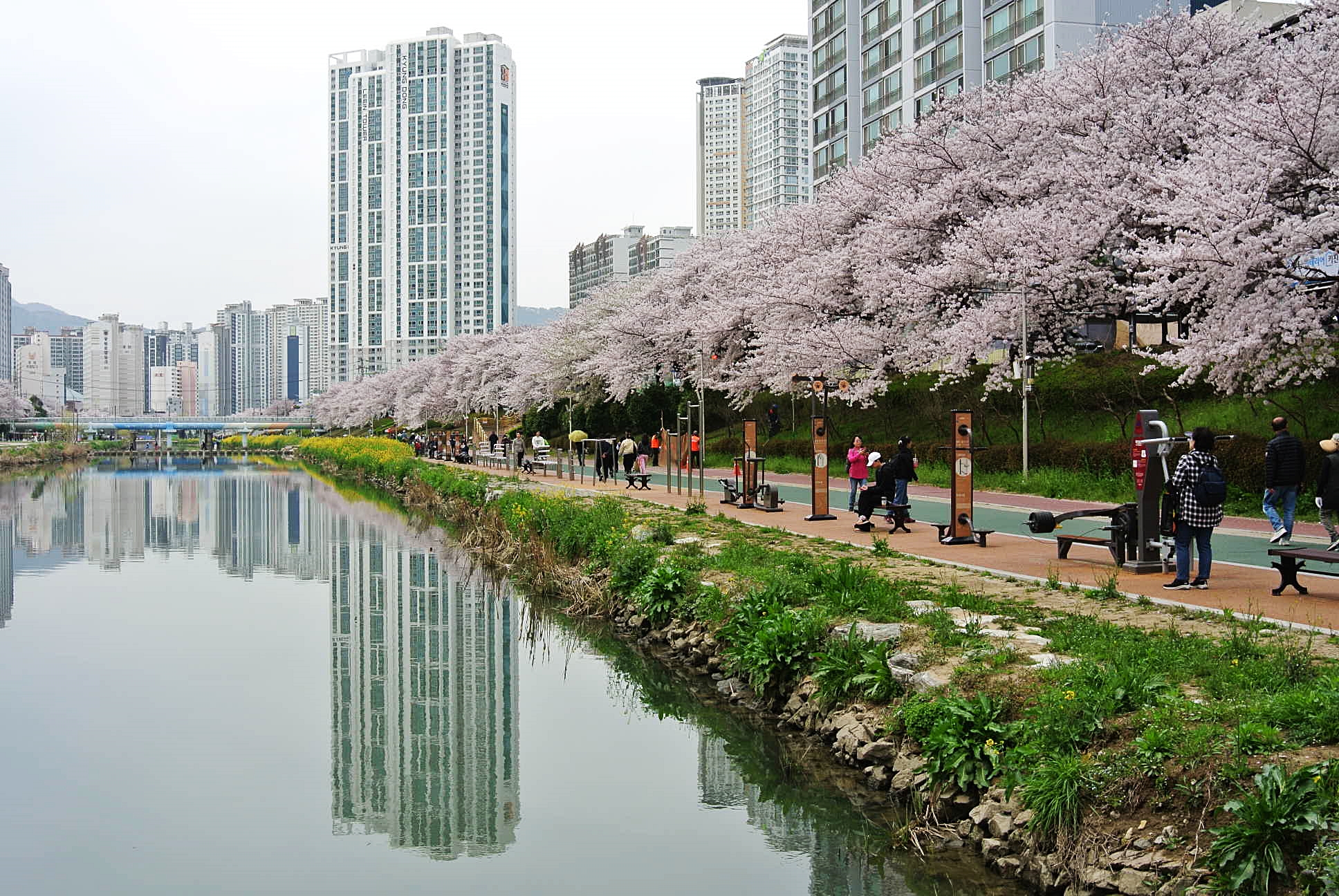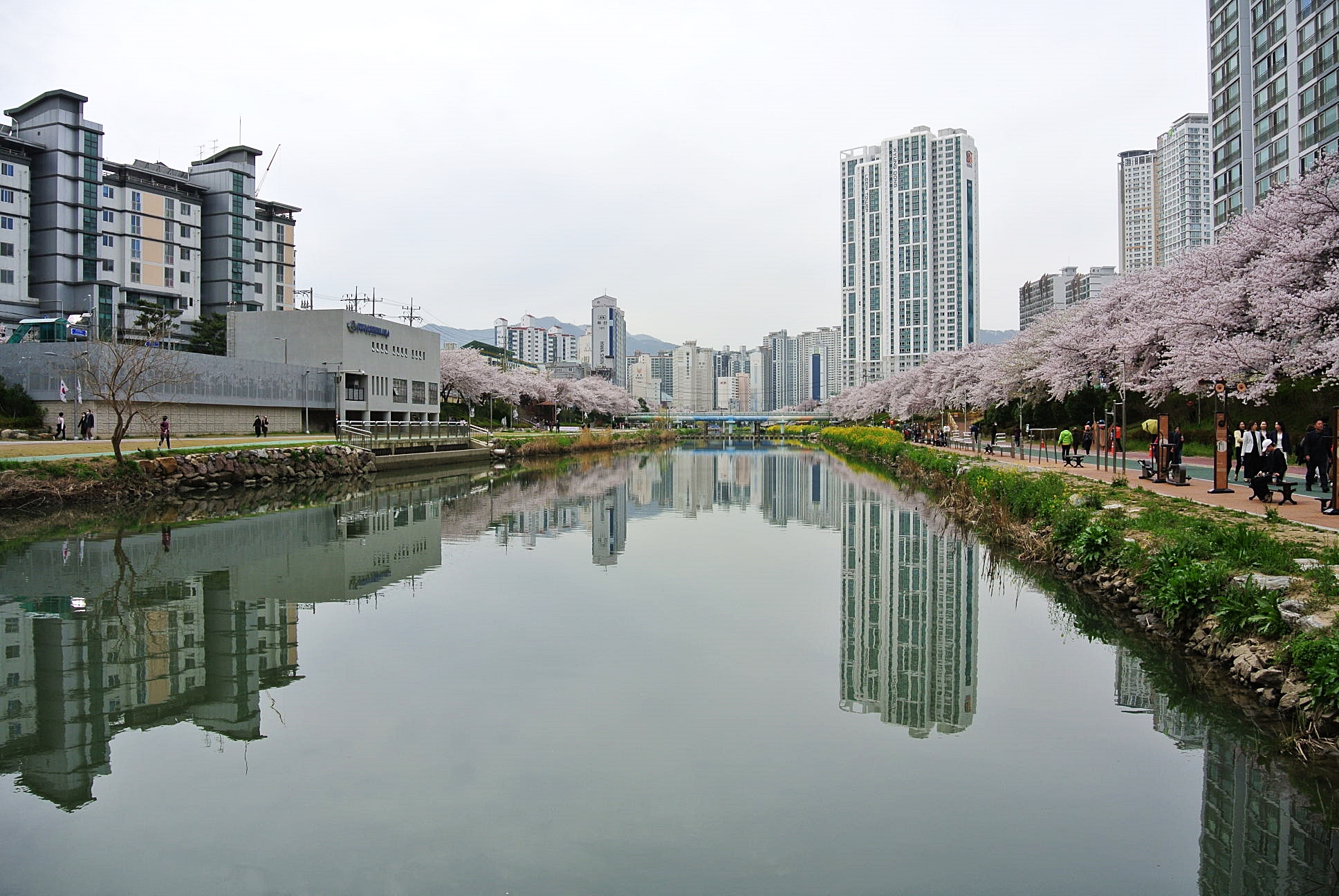 만개하여 절정을 이루고 있는 온천천 벗꽃길 걷는 사람들이 많았다