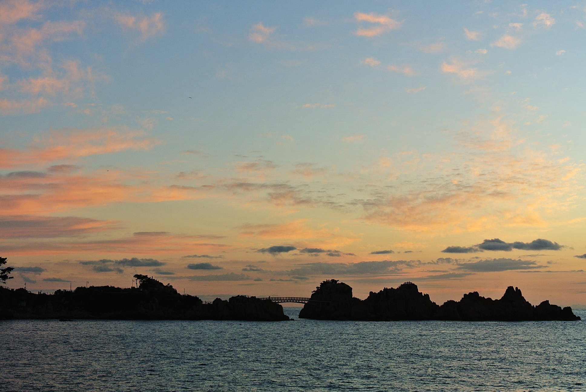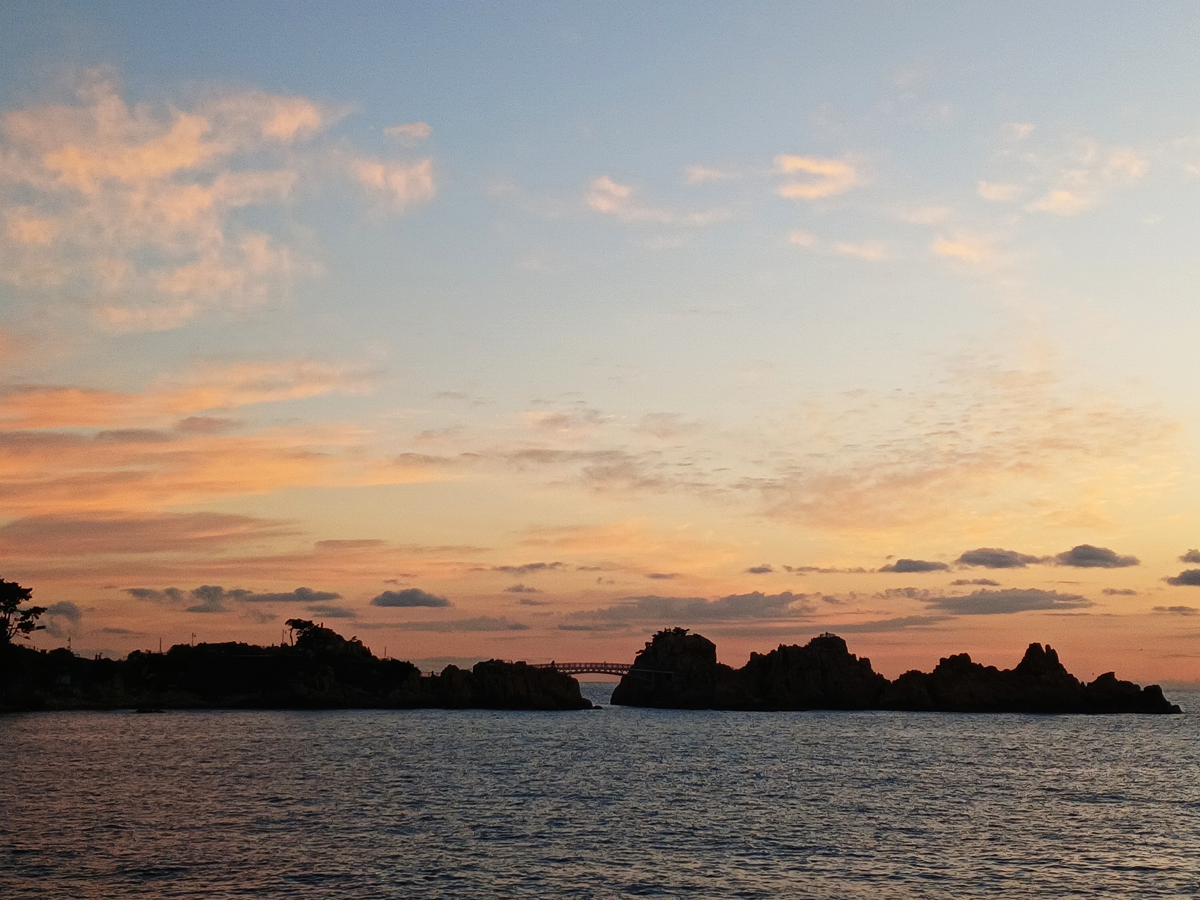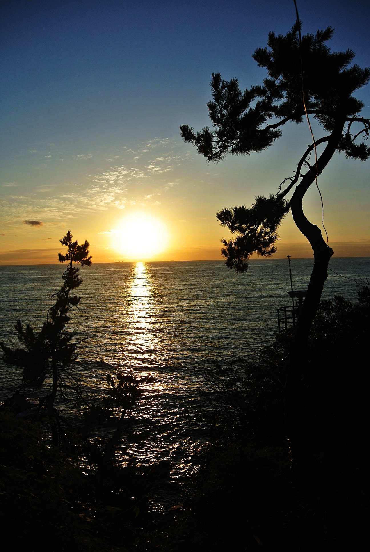 소나무 사이로 붉게 물든 여명이 수평선 위로 띠를 이루고 있었다