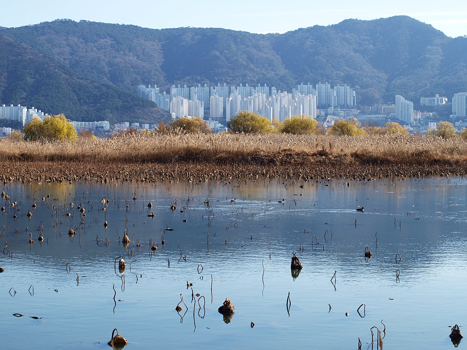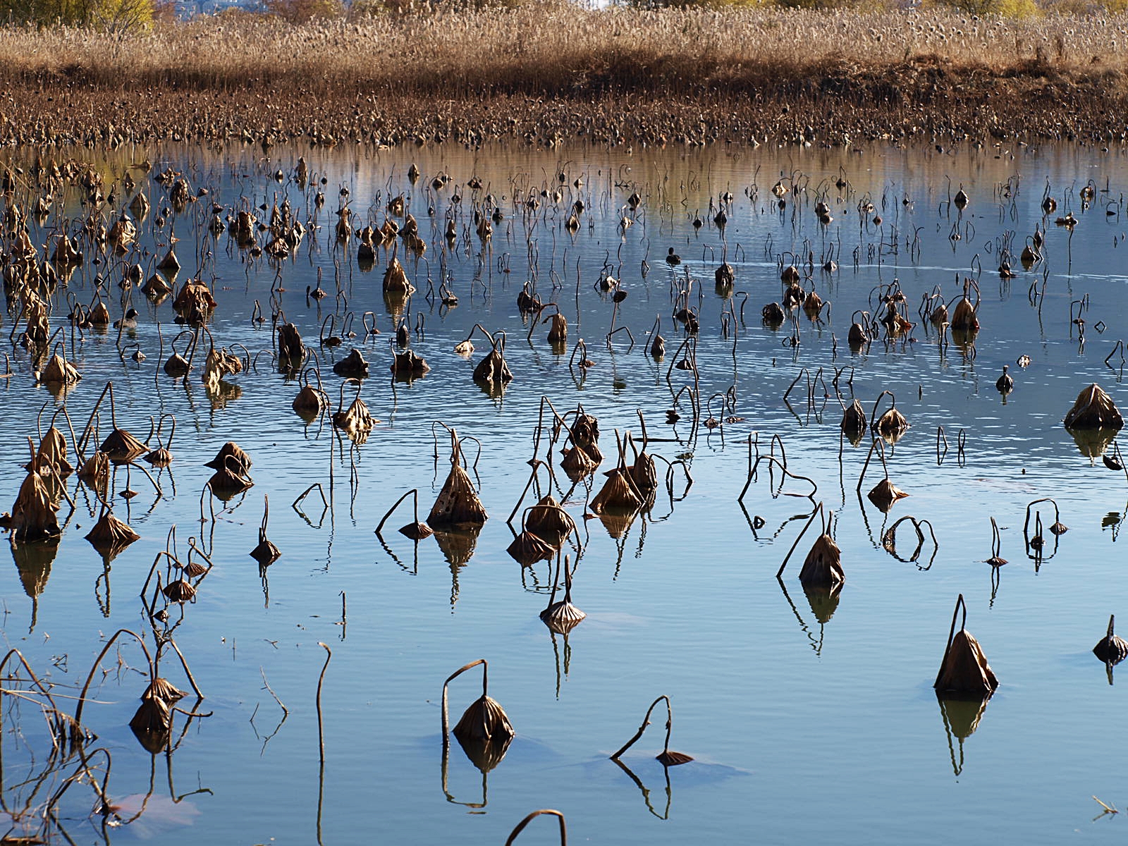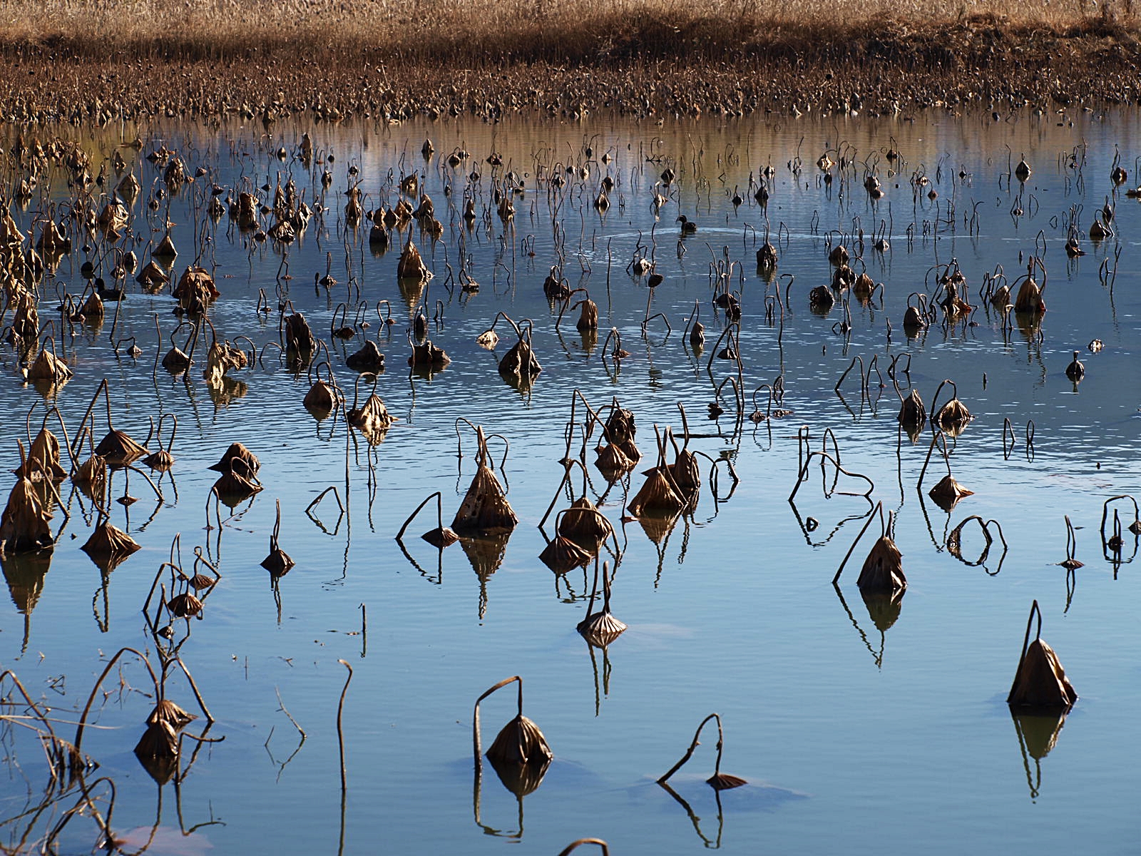 꼬꾸라진 연대 사이로 오리들이 유유히 헤엄치며 지나가고 있다