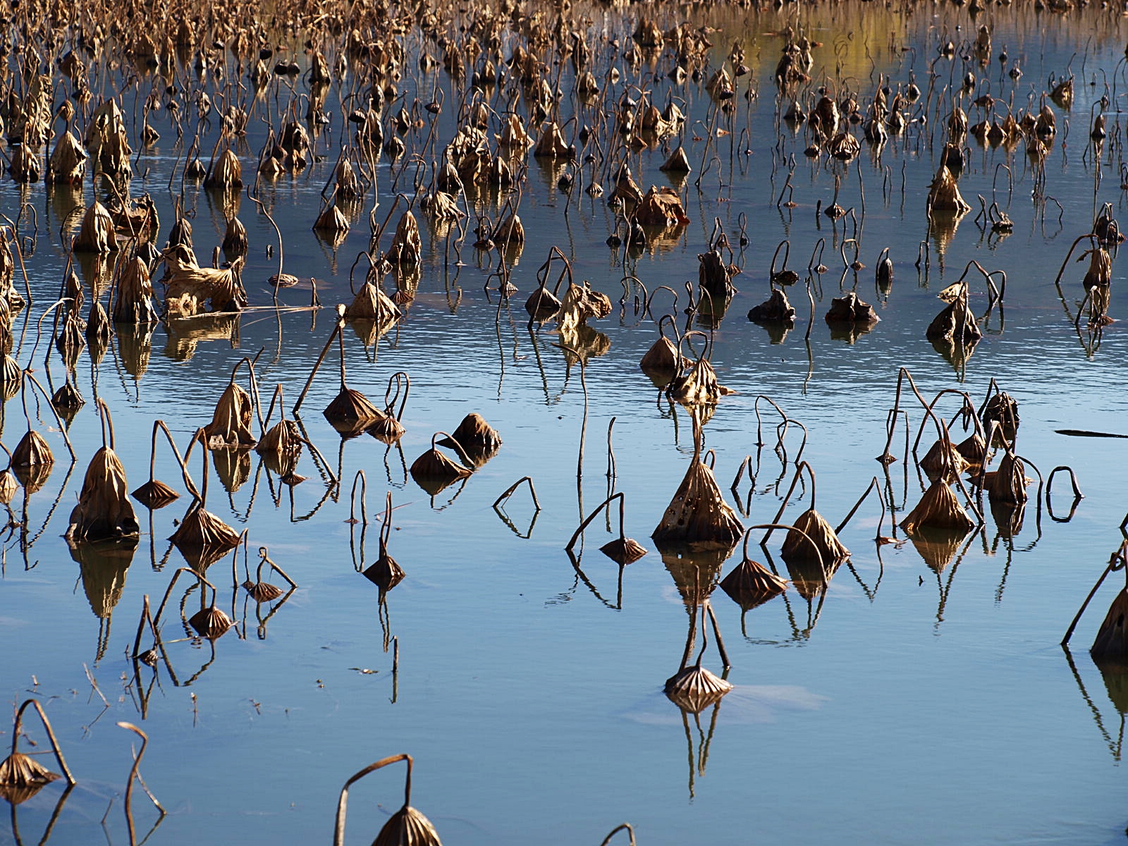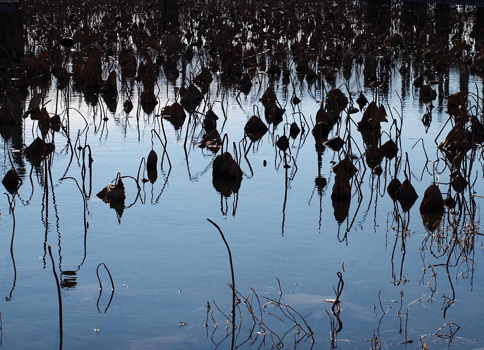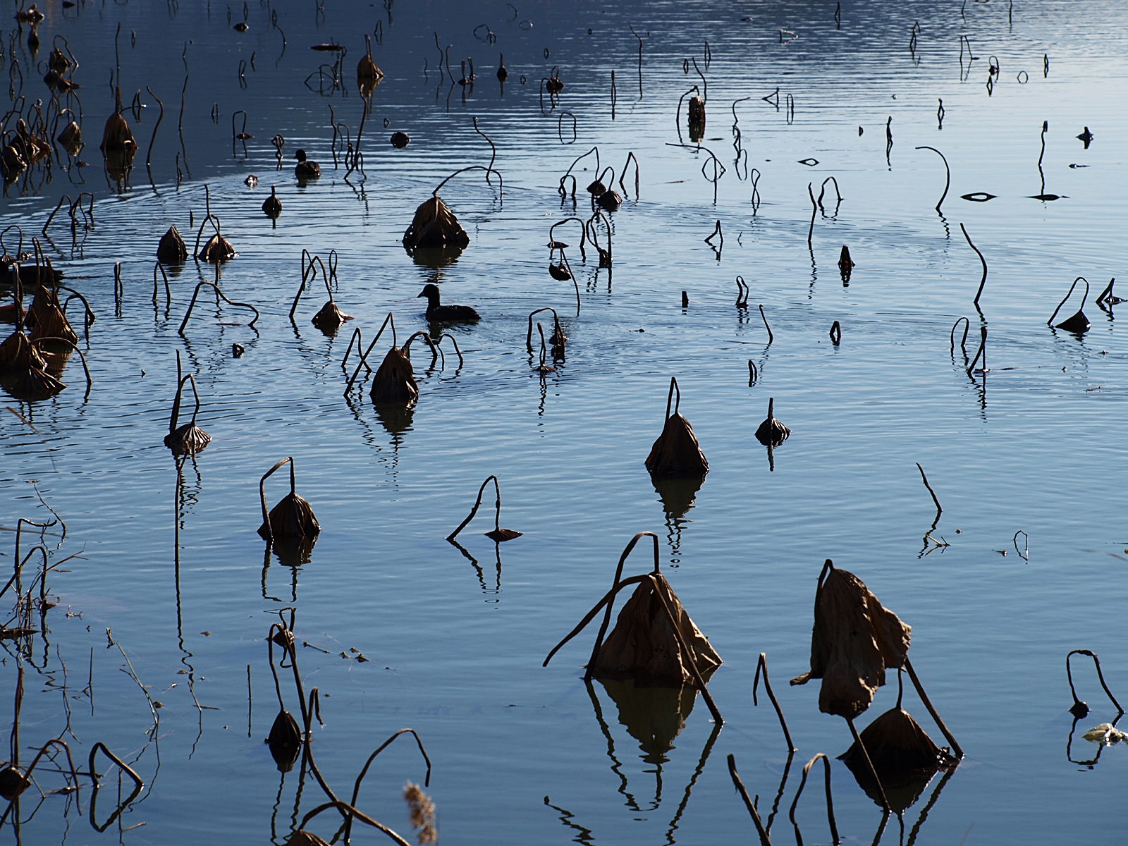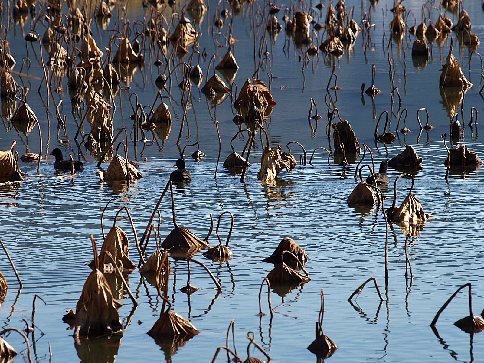 꼬꾸라진 연대 사이로 오리들이 유유히 헤엄치며 지나가고 있다