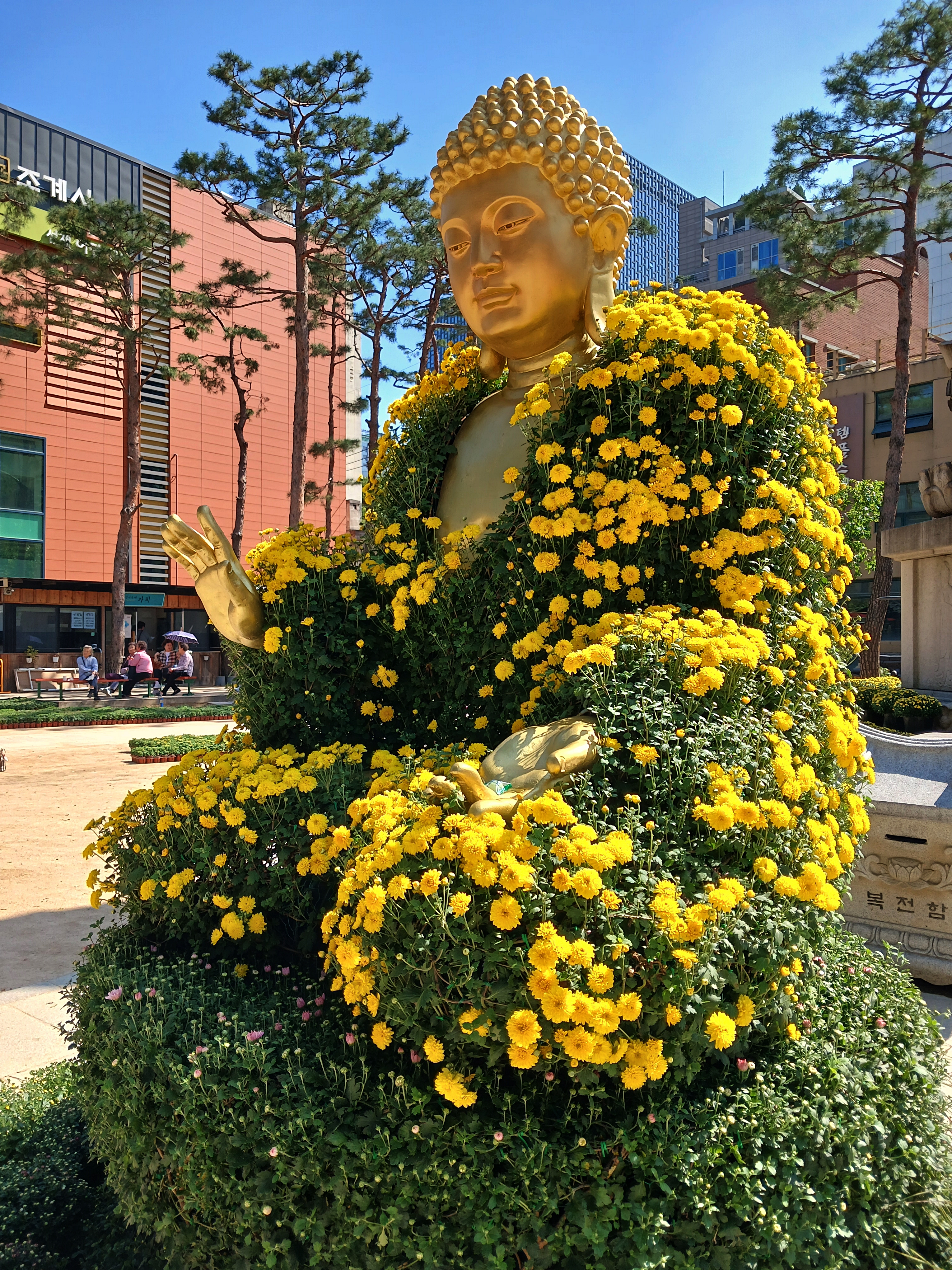 국화꽃으로 장식한 나무아래 부처님이 앉아 계시고